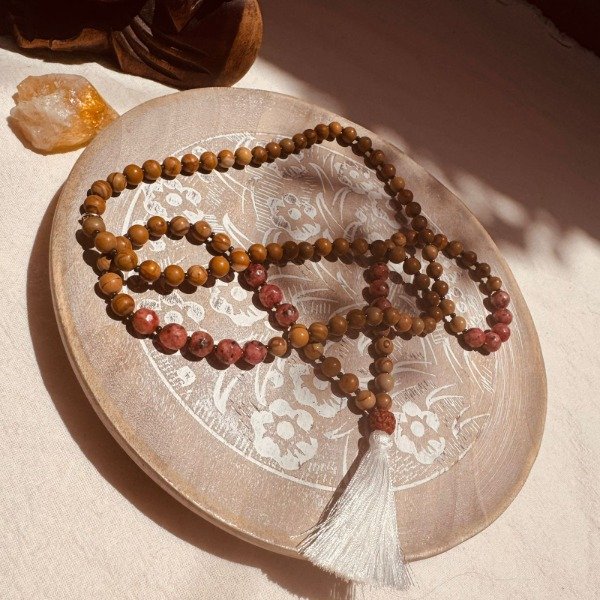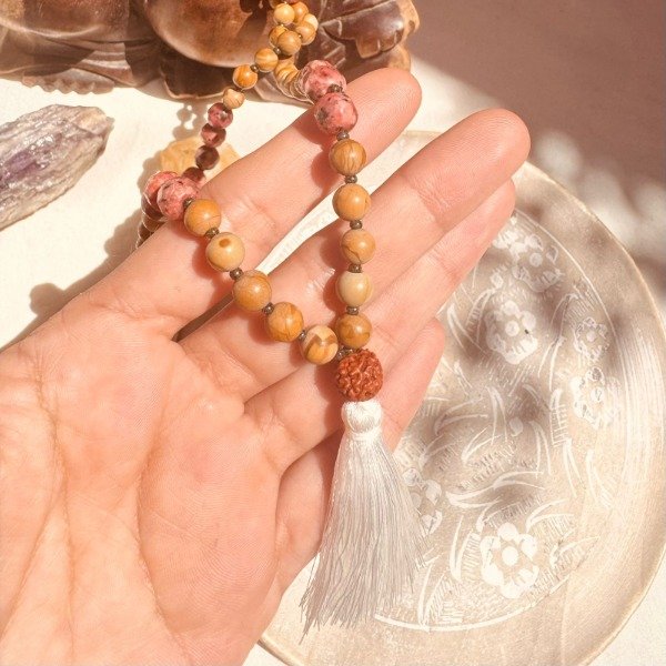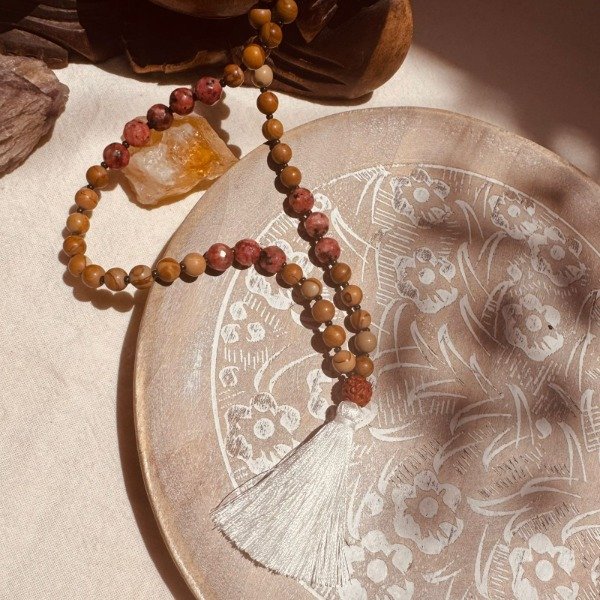 El japamala es una herramienta ancestral usada para meditar, repetir mantras, acompañar oraciones y crear un ancla suave que conecta respiración, presencia y propósito. También puede llevarse como amuleto cotidiano para sostener intención y protección.