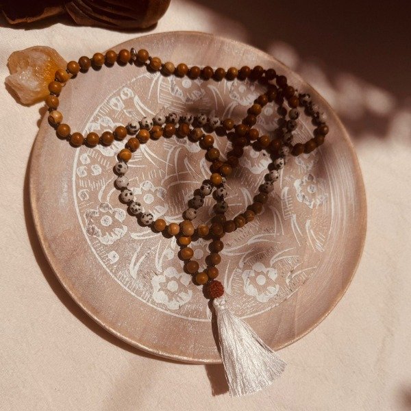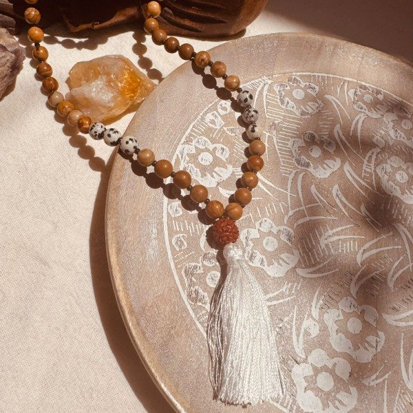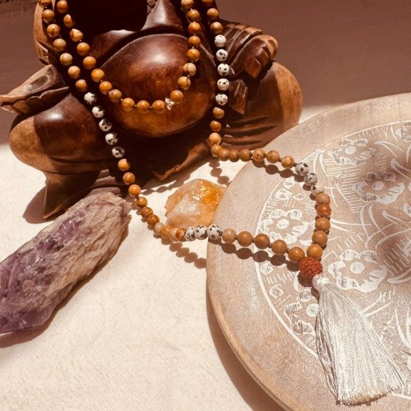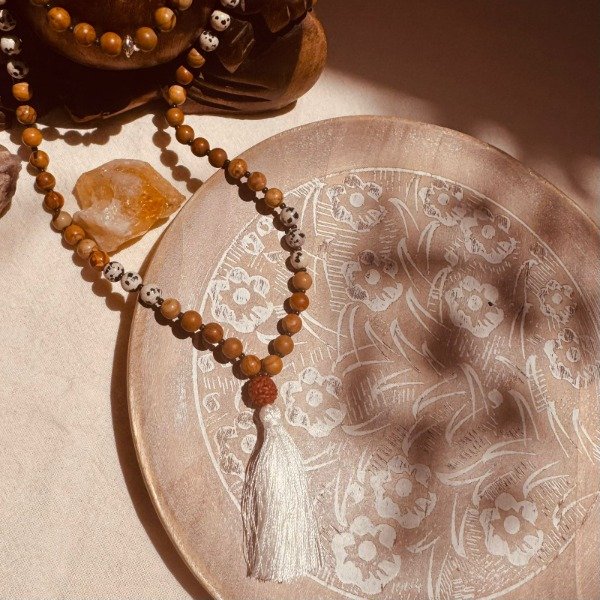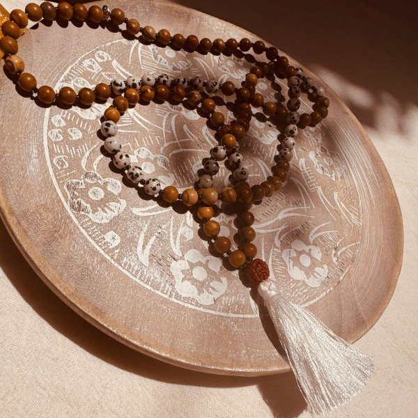 El japamala se utiliza para meditar, repetir mantras, acompañar la respiración o como amuleto protector para llevar intención durante el día.