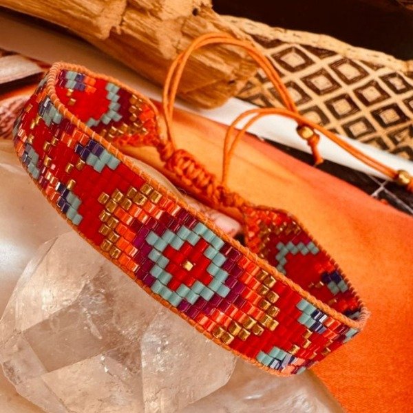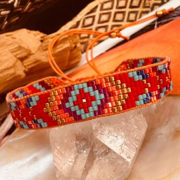 Hecha a mano en la India, esta pulsera está elaborada con la técnica Miyuki en su versión más amplia y detallada.