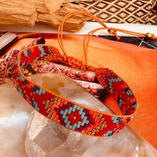 Es una pulsera con presencia, textura y espíritu: un pequeño fragmento de artesanía india que trae consigo color, intención y la energía del trabajo hecho a mano.