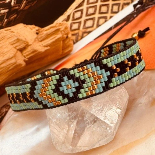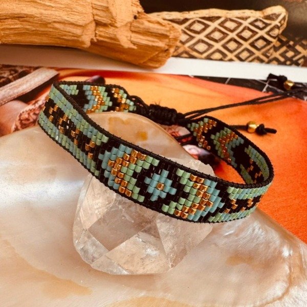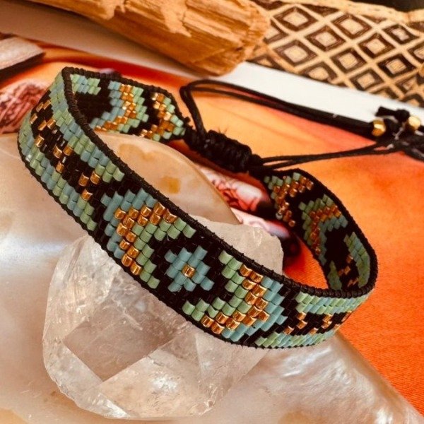 Hecha a mano en la India, esta pulsera está elaborada con la técnica Miyuki en su versión más amplia y detallada.