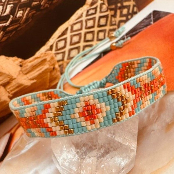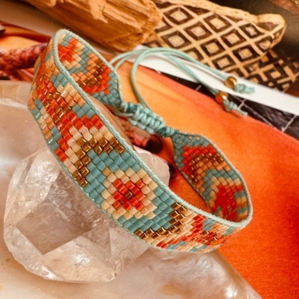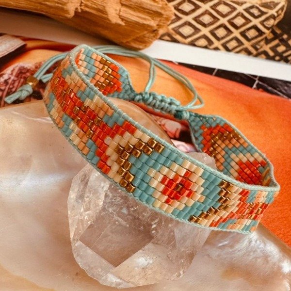 Hecha a mano en la India, esta pulsera está elaborada con la técnica Miyuki en su versión más amplia y detallada.