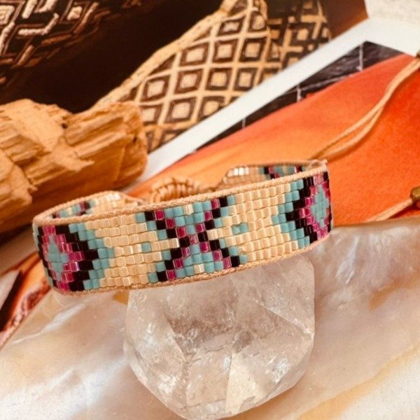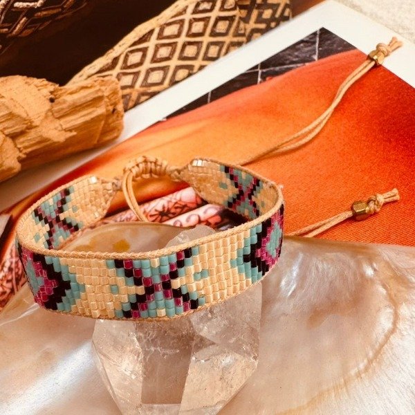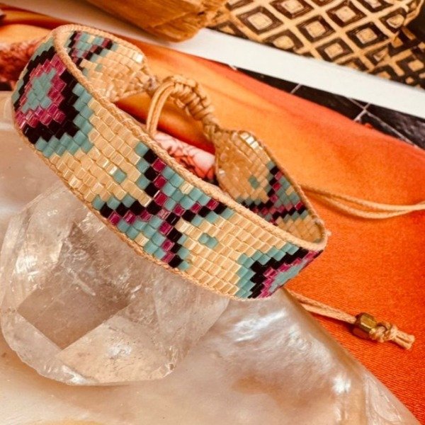 Hecha a mano en la India, esta pulsera está elaborada con la técnica Miyuki en su versión más amplia y detallada.