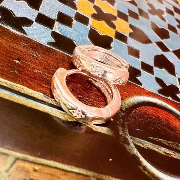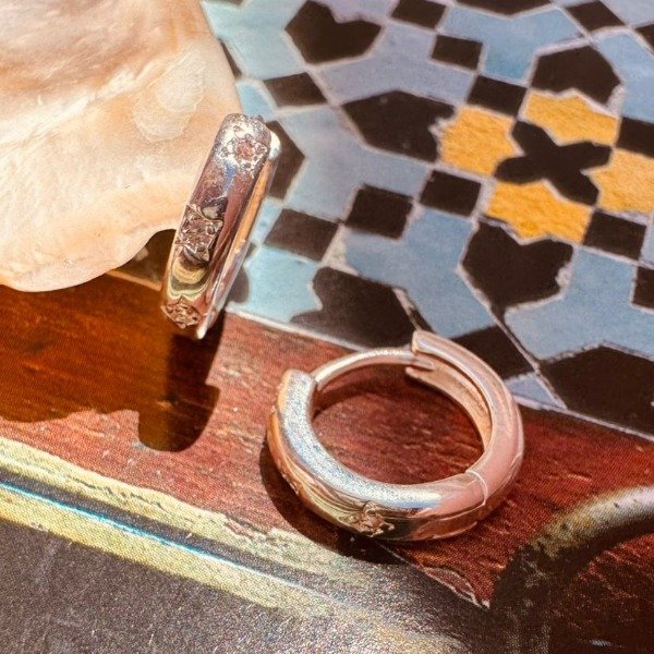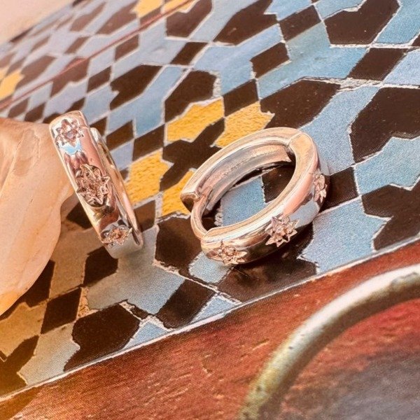 Aros de acero blanco con pequeñas circonias incrustadas en forma de destello.