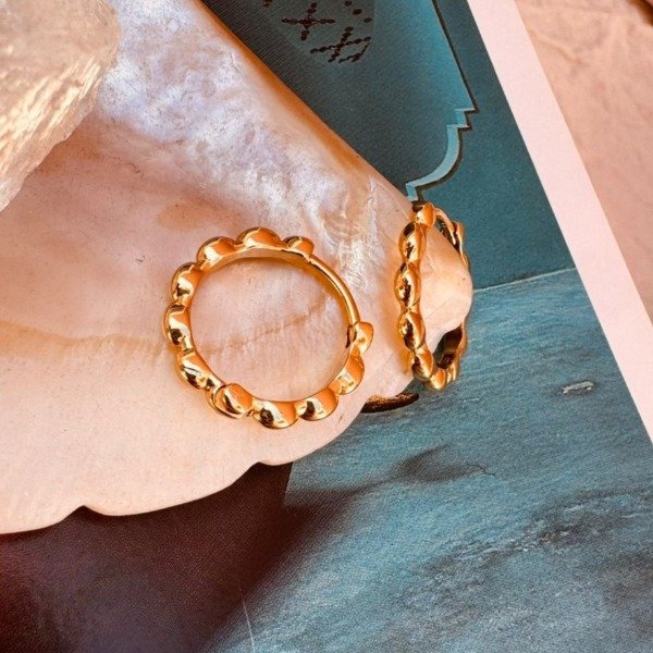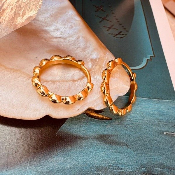Aros de acero dorado con diseño en relieve y terminación brillante.