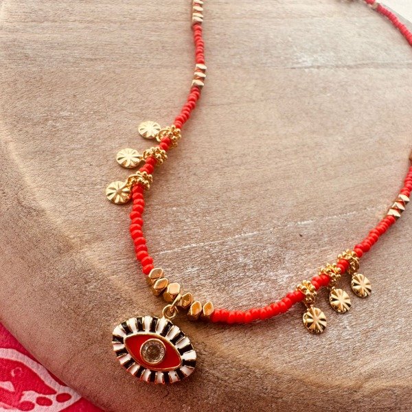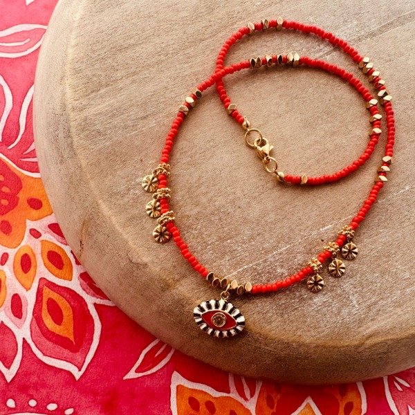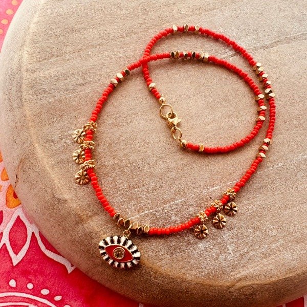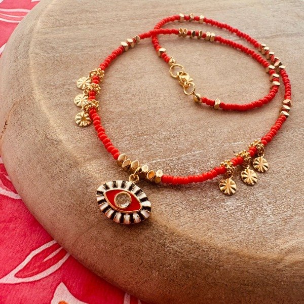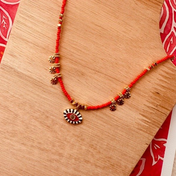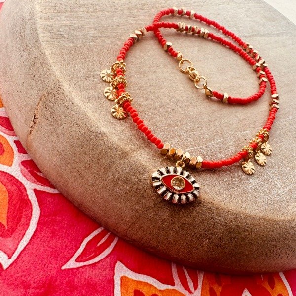 Su dije central, un ojo rojo con destellos dorados, lo convierte en un poderoso amuleto de protección y energía.