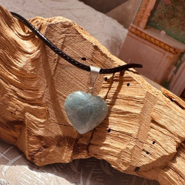 El dije es un corazón pulido, montado sobre un cordón negro trenzado tipo cuero sintético (resistente, liviano y cómodo), de 45 cm de largo.