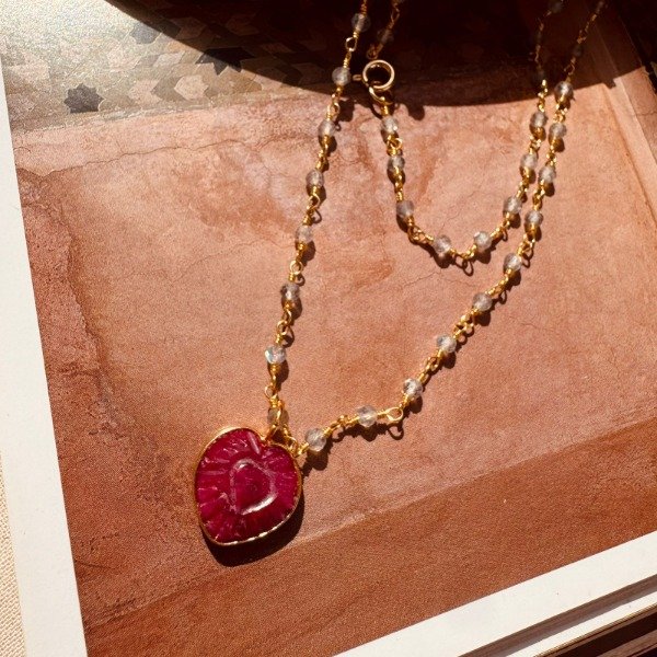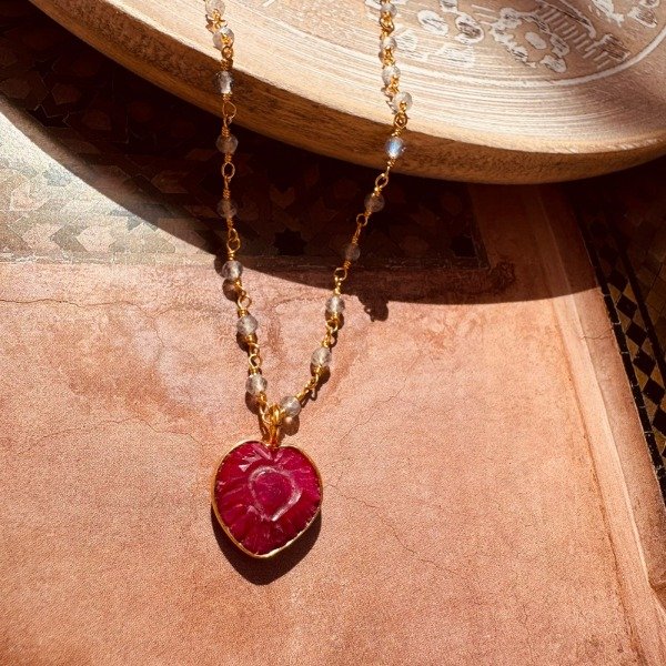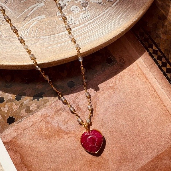 Collar traído desde India, elaborado con cadena de labradorita con baño de oro, y dije de cuarzo cherry tallado a mano en forma de corazón, engarzado también en baño de oro.