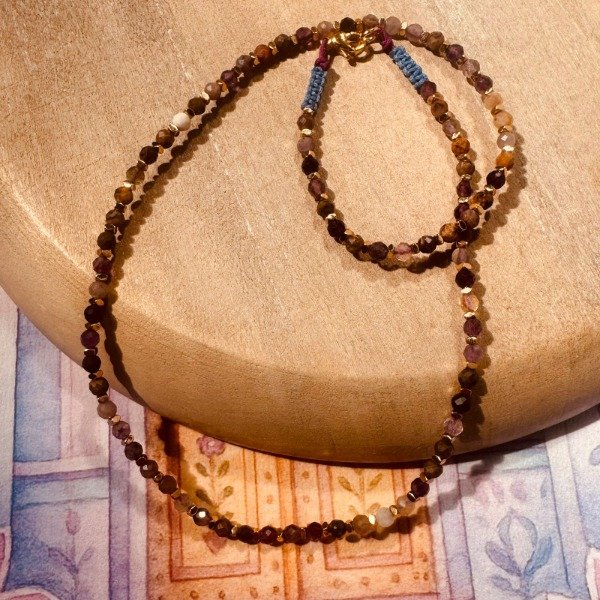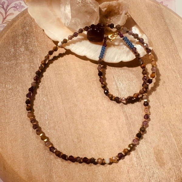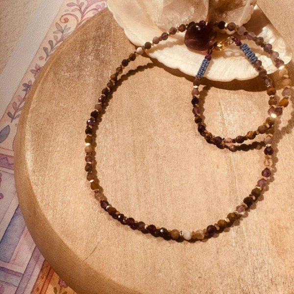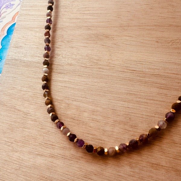 Collar artesanal confeccionado con un mix de piedras naturales facetadas en tonos tierra y púrpuras, acompañado de separadores de hematite que aportan equilibrio y elegancia.