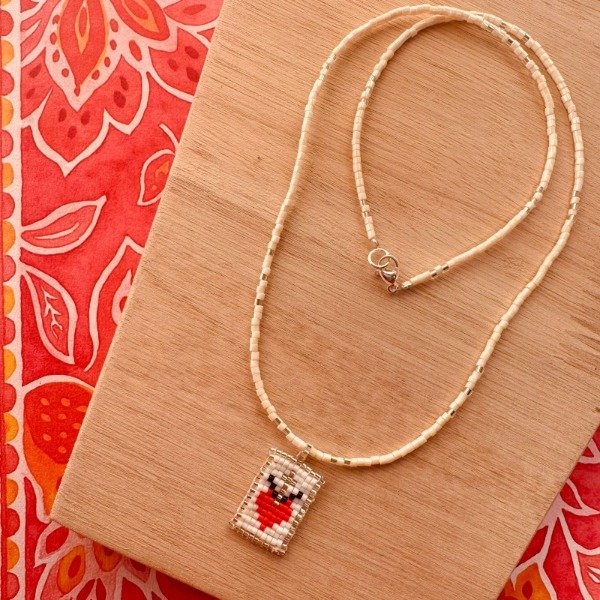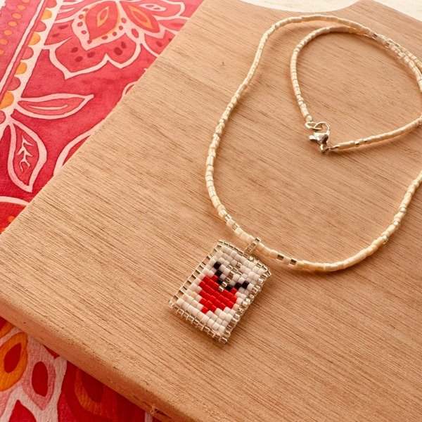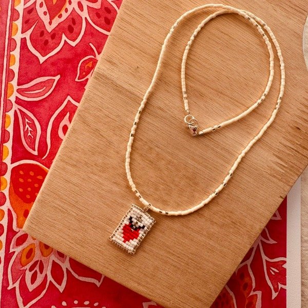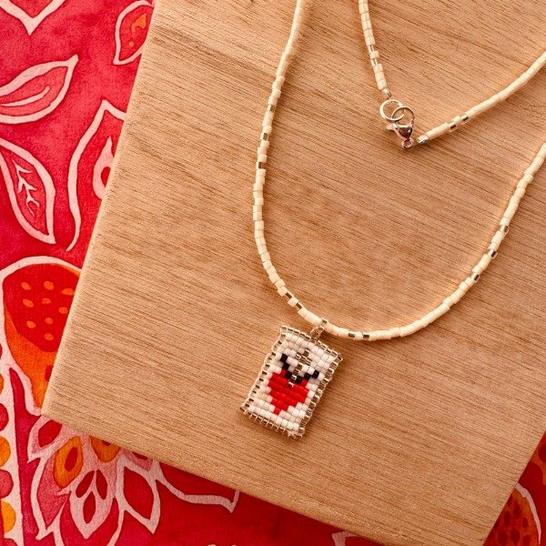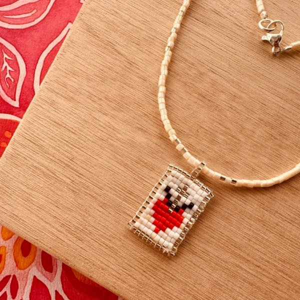 Collar hecho a mano con mostacillas japonesas Miyuki, delicadamente tejidas para formar un dije con diseño de corazón en tonos rojo, blanco y plateado.