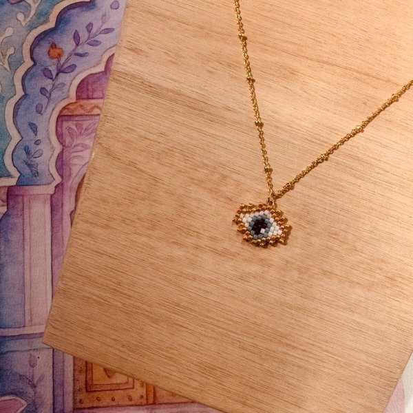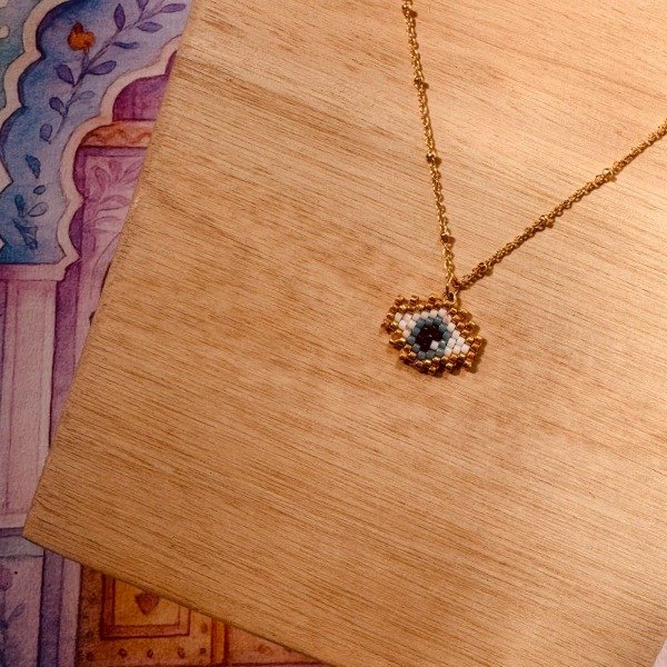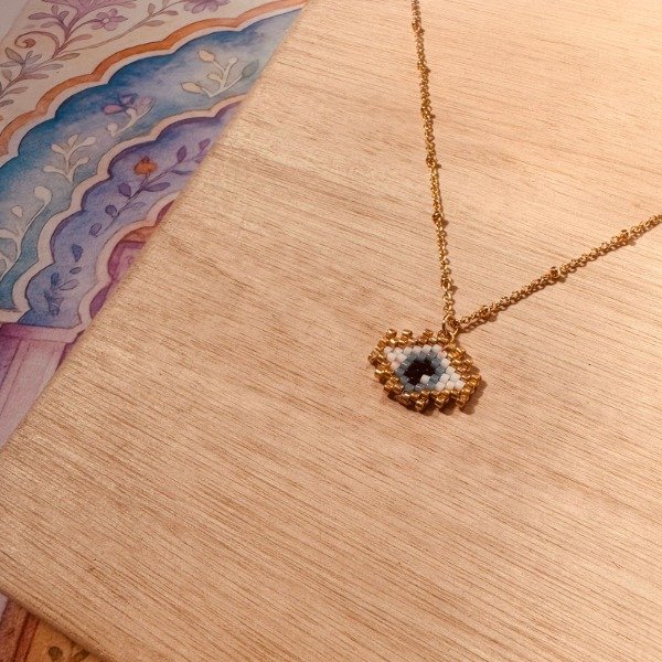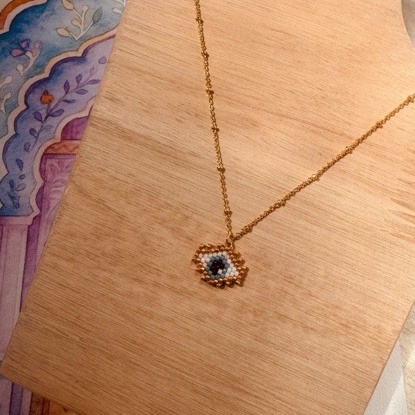 Collar con dije tejido a mano en mostacillas japonesas Miyuki, con diseño del clásico ojo protector en tonos blanco, negro y azul, enmarcado en dorado.