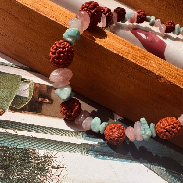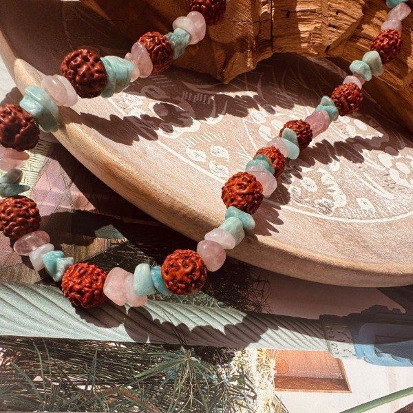 Cuando estas tres energías se combinan, se potencian: la rudraksha protege, la amazonita calma y el cuarzo rosa abre. Juntas crean un amuleto que sostiene, equilibra y acompaña procesos internos con suavidad, sin perder dirección.