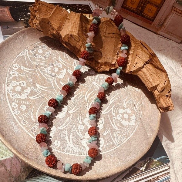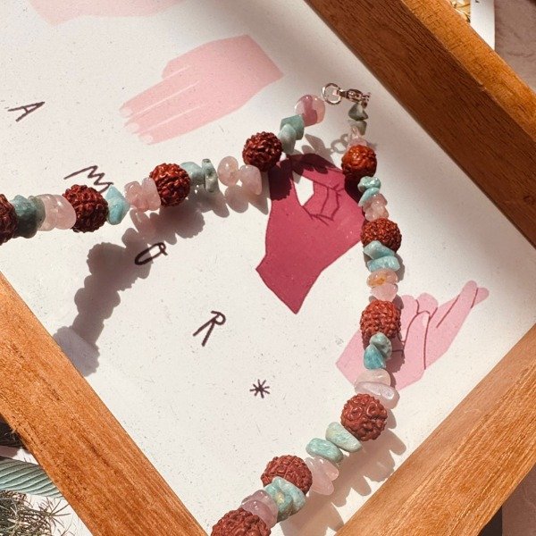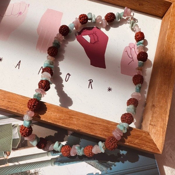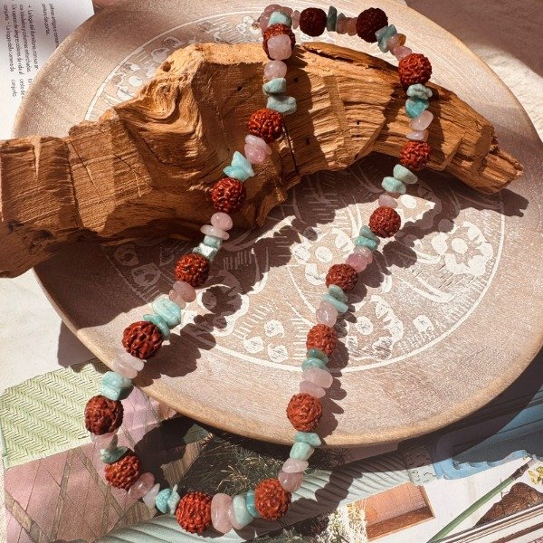 Este collar une tres energías que se complementan de manera perfecta: la fuerza espiritual de las rudraksha, la dulzura del cuarzo rosa y la calma protectora de la amazonita. Cada elemento fue elegido para crear un amuleto que acompañe el día con intención, suavidad y claridad emocional.