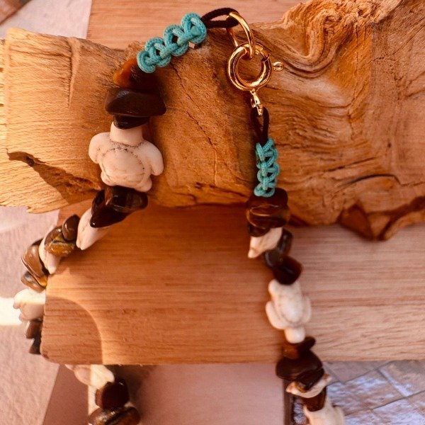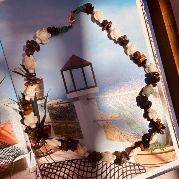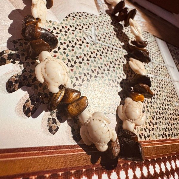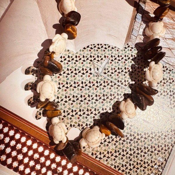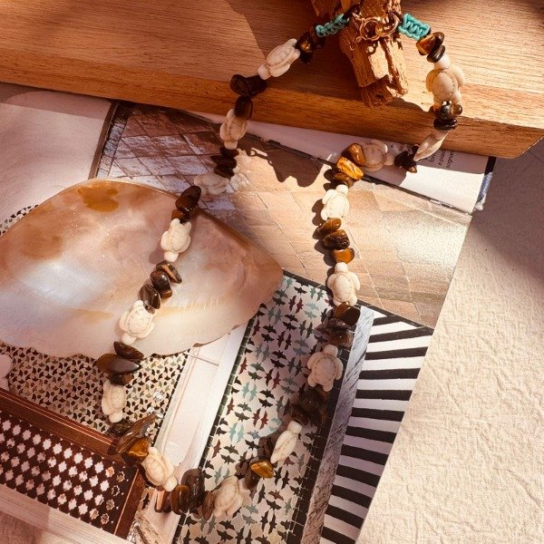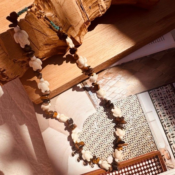 Este collar reúne dos símbolos poderosos: la tortuga como amuleto ancestral de estabilidad y sabiduría, y el ojo de tigre como piedra protectora que fortalece la confianza y la claridad.