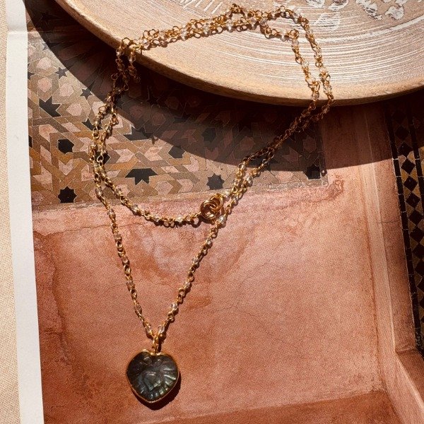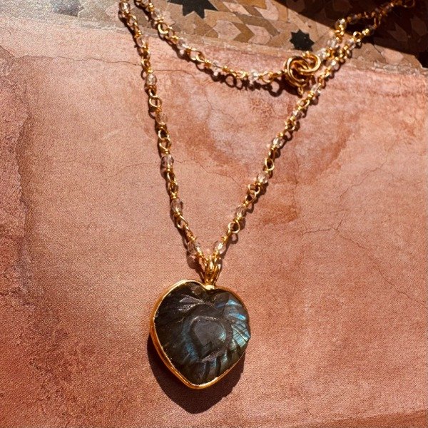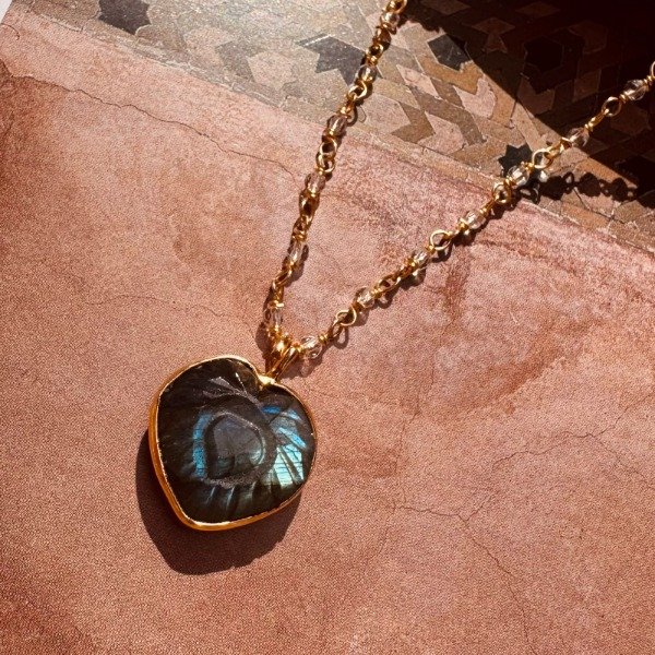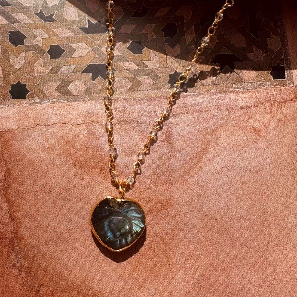 El dije es un corazón de labradorita tallado a mano, engarzado con baño de oro.