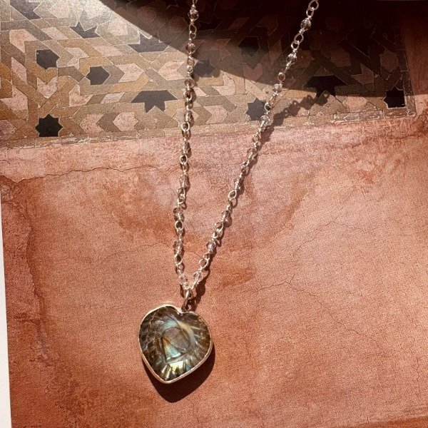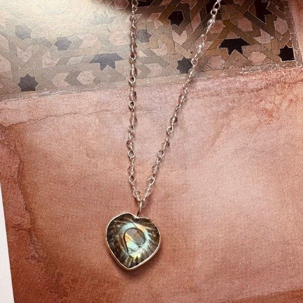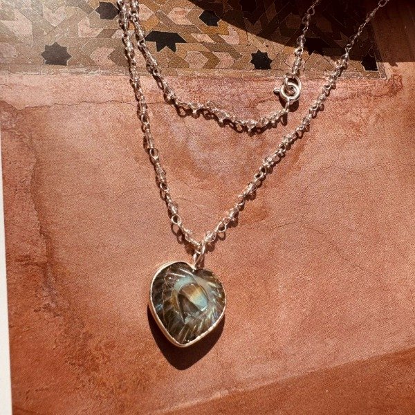 El dije es un corazón de labradorita tallado a mano, engarzado con baño de plata.