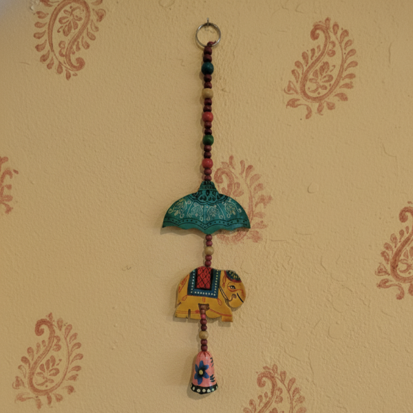 Este es el arte que viaja sin prisa. Una pieza genuina tallada en madera de Mango, acabada a mano. Cada cuenta ha sido enfilada con intención, creando una columna que desciende hacia la figura central del elefante. Un detalle es la inclusión de un pequeño cascabel metálico pintado, que añade un toque sonoro y vibrante a su esencia.