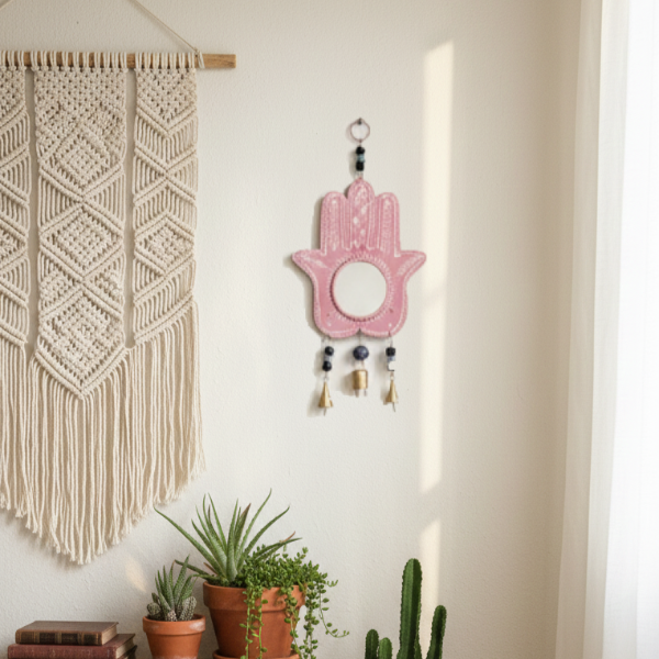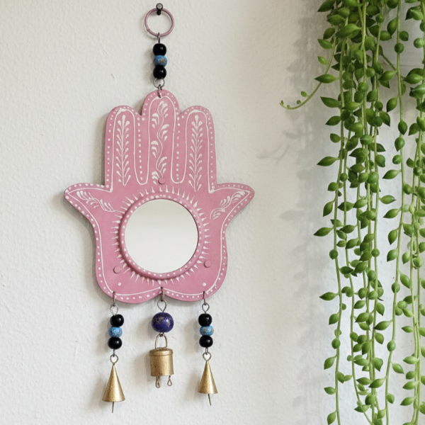 Esta Hamsa de metal combina diseño tradicional, detalles pintados a mano y un espejo central pensado para reflejar y desviar cualquier energía densa, manteniendo la protección activa en tu hogar.