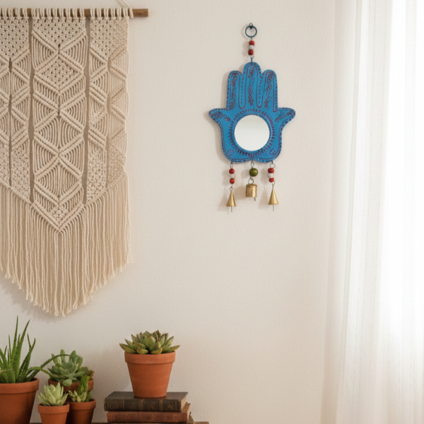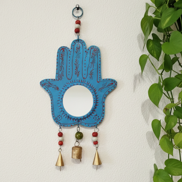 Esta Hamsa de metal combina diseño tradicional, detalles pintados a mano y un espejo central pensado para reflejar y desviar cualquier energía densa, manteniendo la protección activa en tu hogar.