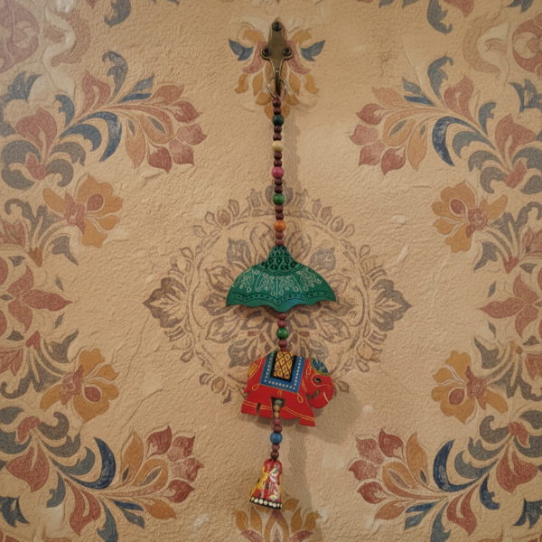 Este es el arte que viaja sin prisa. Una pieza genuina tallada en madera de Mango, acabada a mano. Cada cuenta ha sido enfilada con intención, creando una columna que desciende hacia la figura central del elefante. Un detalle es la inclusión de un pequeño cascabel metálico pintado, que añade un toque sonoro y vibrante a su esencia.