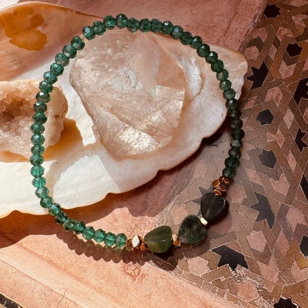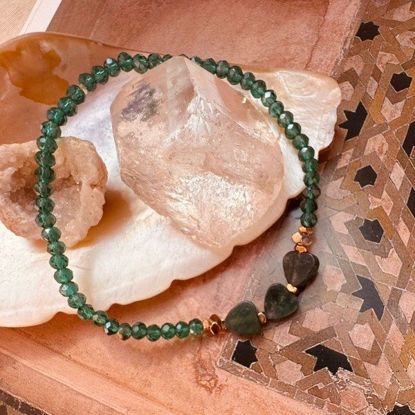 Pulsera elastizada con corazones de aventurina verde, cristales de roca facetados y detalles dorados de hematite.