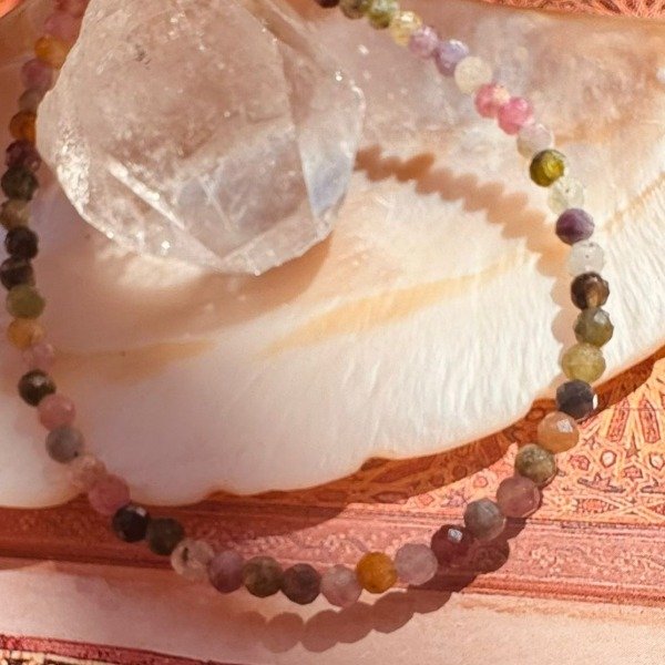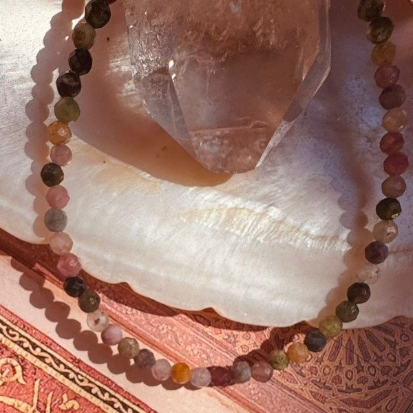 Esta pulsera está hecha íntegramente de turmalina sandía, una de las piedras más especiales por su capacidad de unir dos fuerzas fundamentales: la protección de la turmalina verde y la apertura emocional de la rosa.