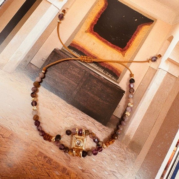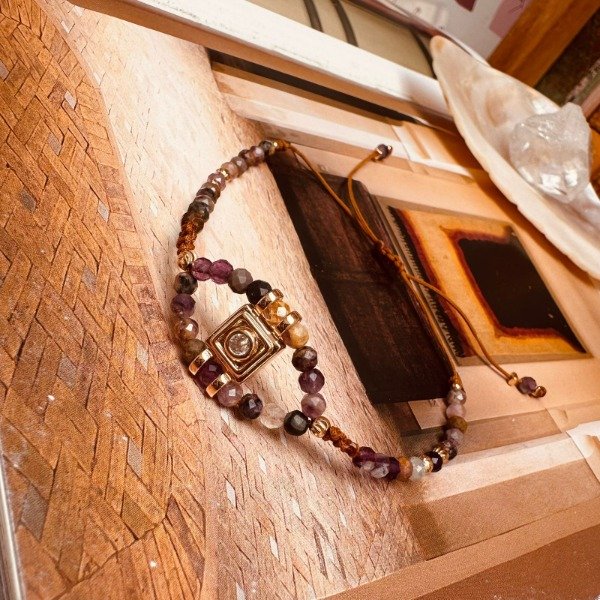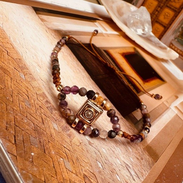 Está acompañada por una combinación de piedras naturales en tonos tierra, amatistados y dorados, que aportan equilibrio y conexión.