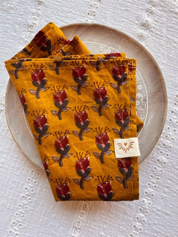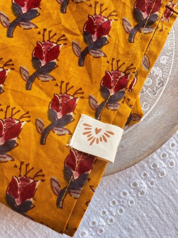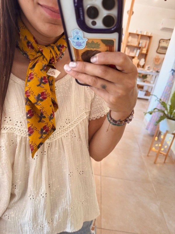 Hechos en 100% algodón de la India, estampados a mano con la técnica ancestral block print, estos pañuelos son el toque perfecto de estilo artesanal y versatilidad.