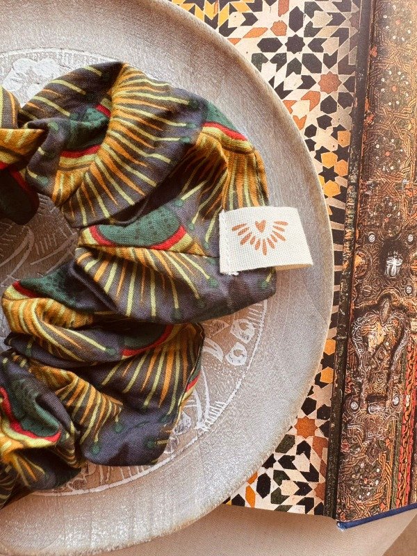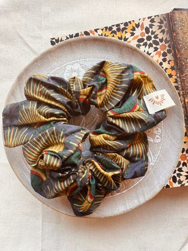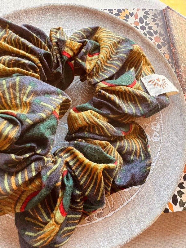 Scrunchie confeccionado en 100 % algodón indio, estampado artesanalmente con la técnica tradicional Block Print, donde cada diseño es impreso a mano mediante sellos tallados en madera.