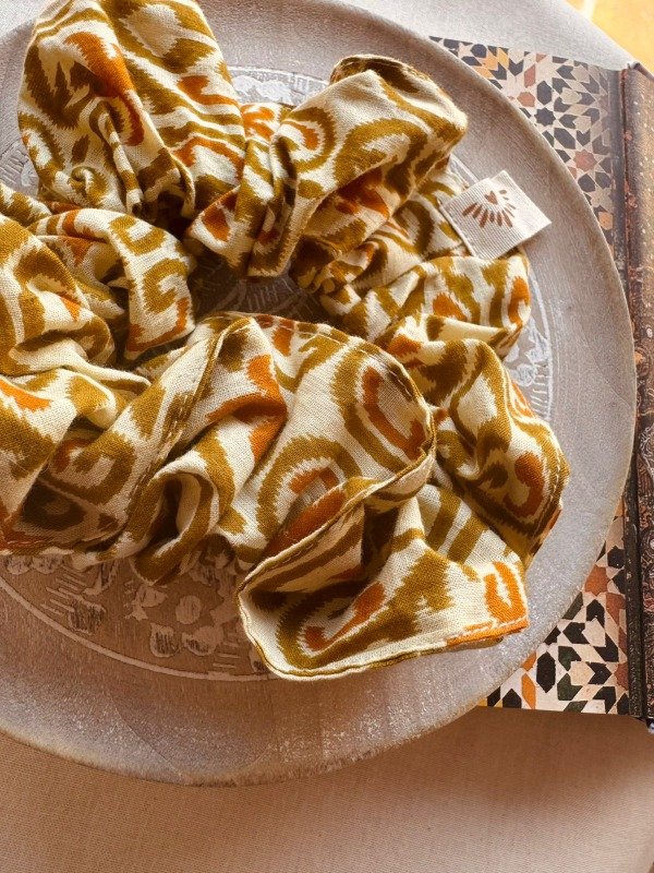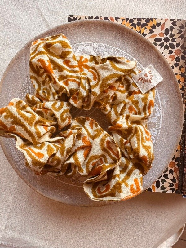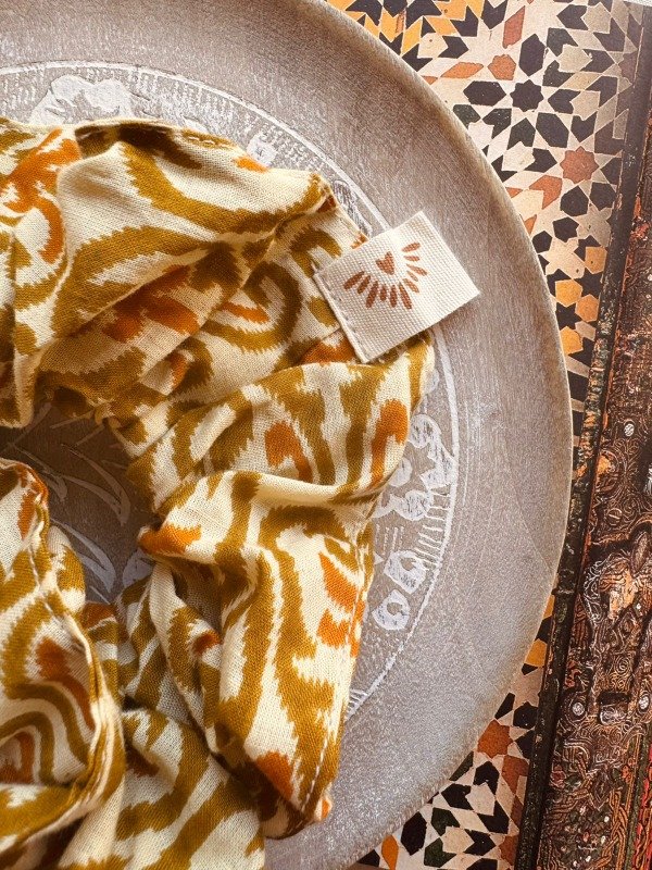 Scrunchie confeccionado en 100 % algodón indio, estampado artesanalmente con la técnica tradicional Block Print, donde cada diseño es impreso a mano mediante sellos tallados en madera.