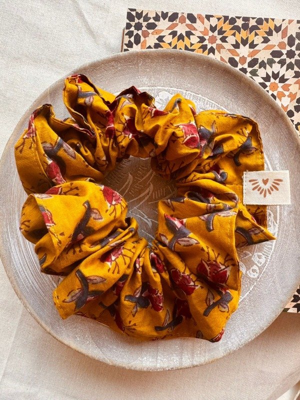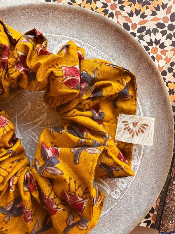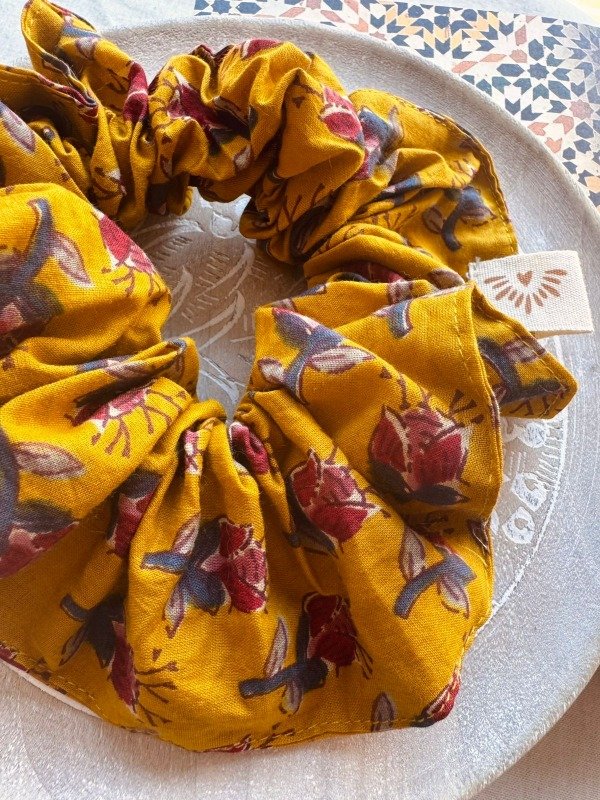 Scrunchie confeccionado en 100 % algodón indio, estampado artesanalmente con la técnica tradicional Block Print, donde cada diseño es impreso a mano mediante sellos tallados en madera.