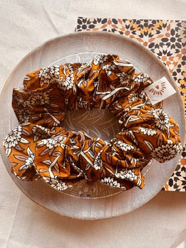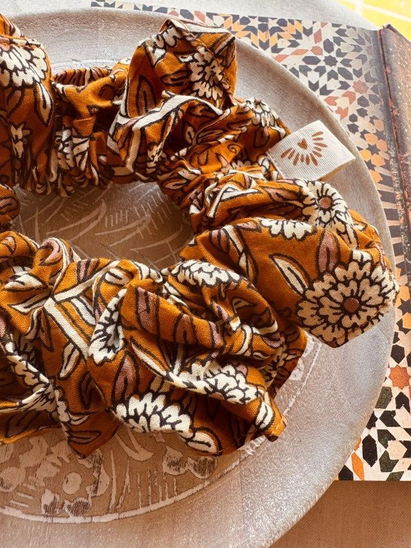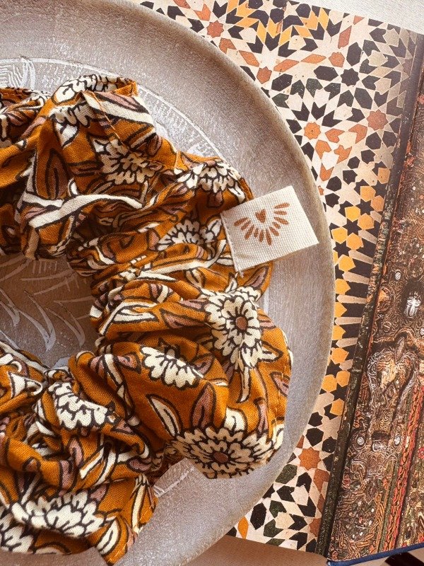 Scrunchie confeccionado en 100 % algodón indio, estampado artesanalmente con la técnica tradicional Block Print, donde cada diseño es impreso a mano mediante sellos tallados en madera.