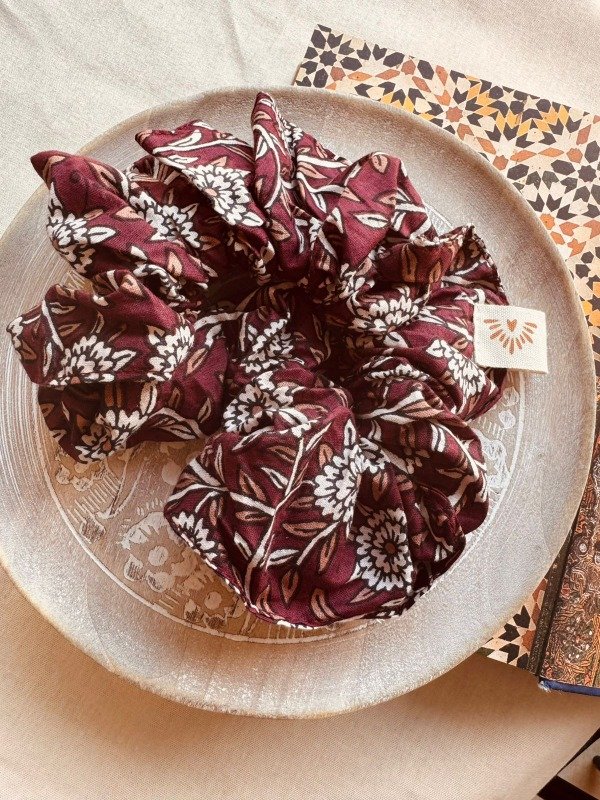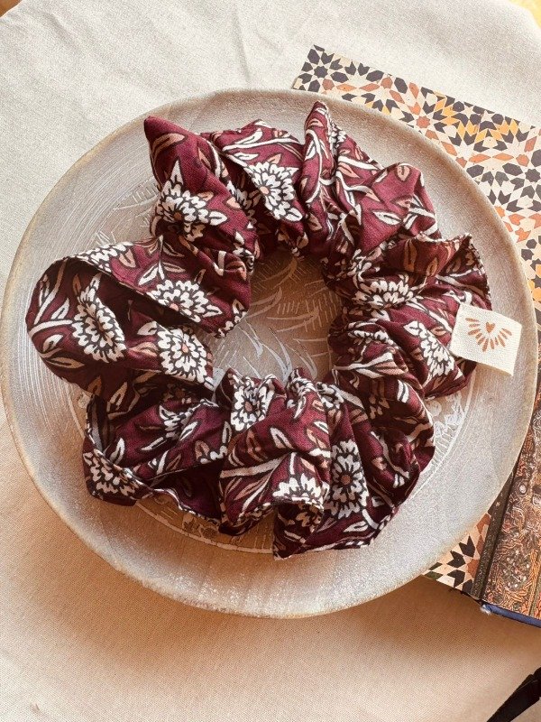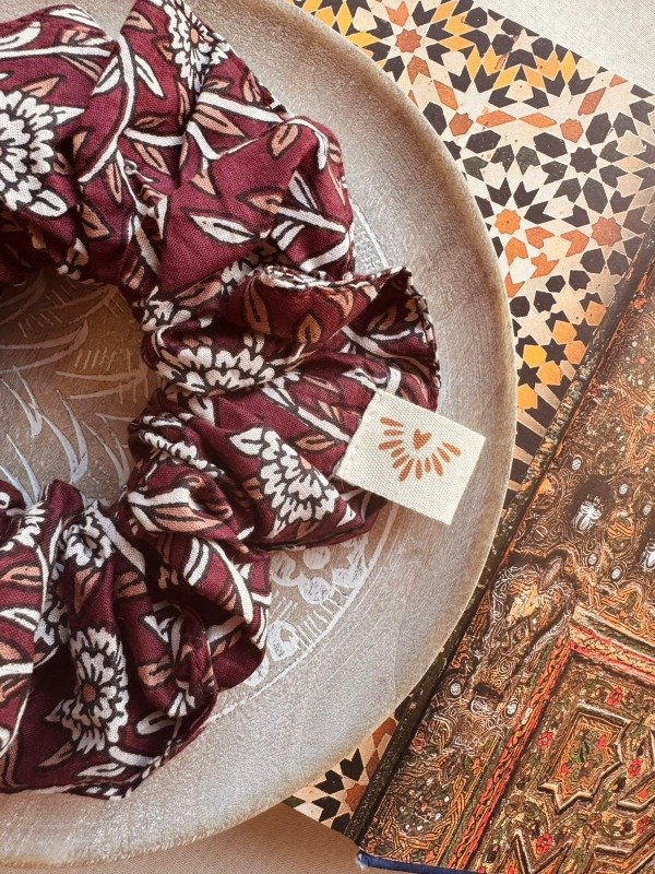 Scrunchie confeccionado en 100 % algodón indio, estampado artesanalmente con la técnica tradicional Block Print, donde cada diseño es impreso a mano mediante sellos tallados en madera.