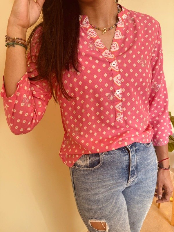 Blusa confeccionada en 100 % algodón indio, reconocida por su suavidad, frescura y ligereza. Cada pieza es elaborada artesanalmente en la India, utilizando técnicas de estampado tradicionales.