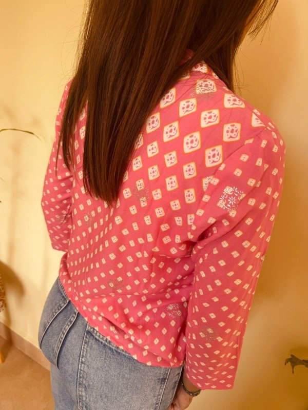 El diseño combina un estampado geométrico en tonos rosados con pequeños detalles plateados integrados en la estampa, que aportan un brillo sutil y armónico. Su textura liviana la convierte en una prenda versátil, ideal tanto para usar en días cálidos como en entretiempo.