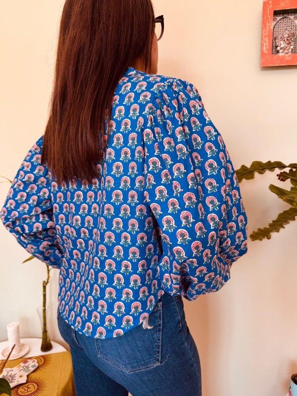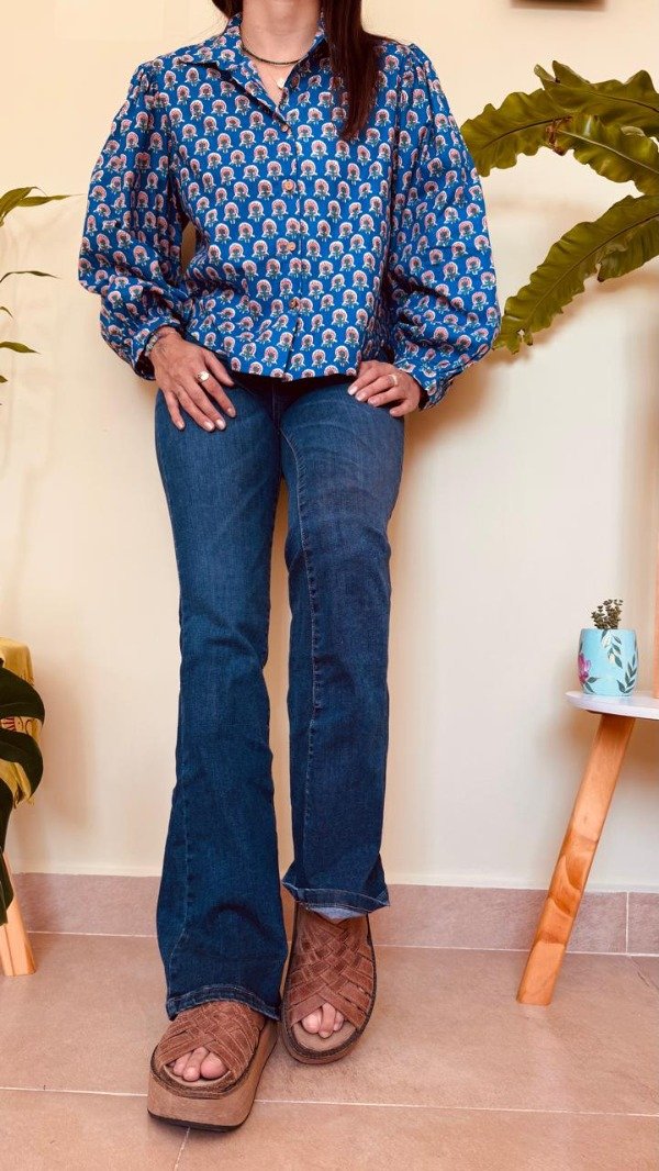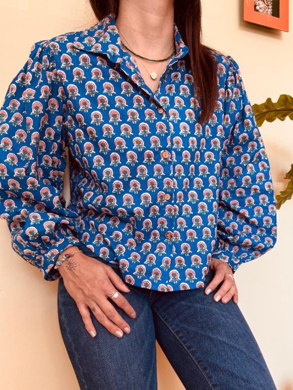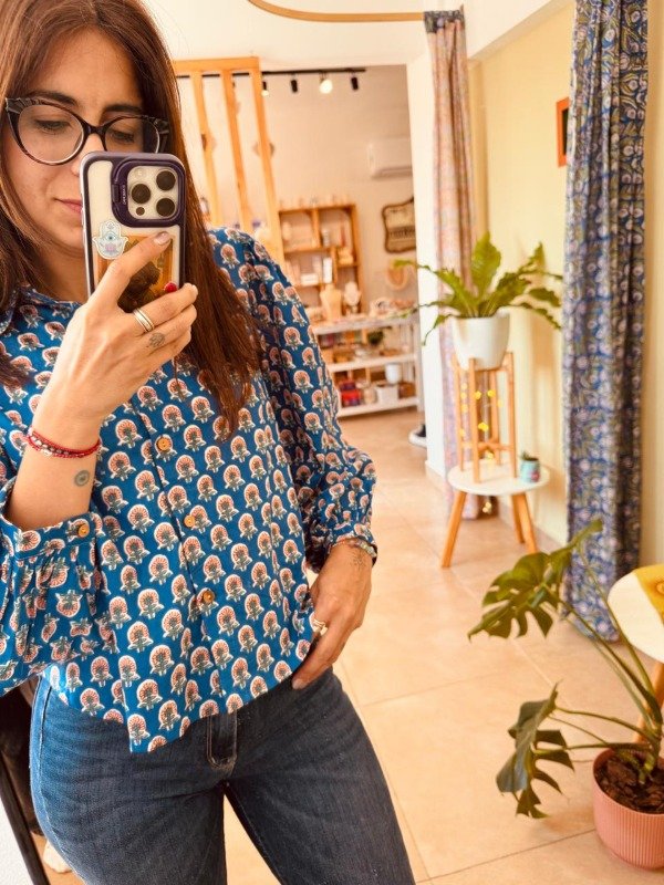 Esta camisa está confeccionada en 100% algodón, trabajada artesanalmente en la India con la técnica ancestral block print, donde cada motivo se estampa a mano con sellos tallados en madera.