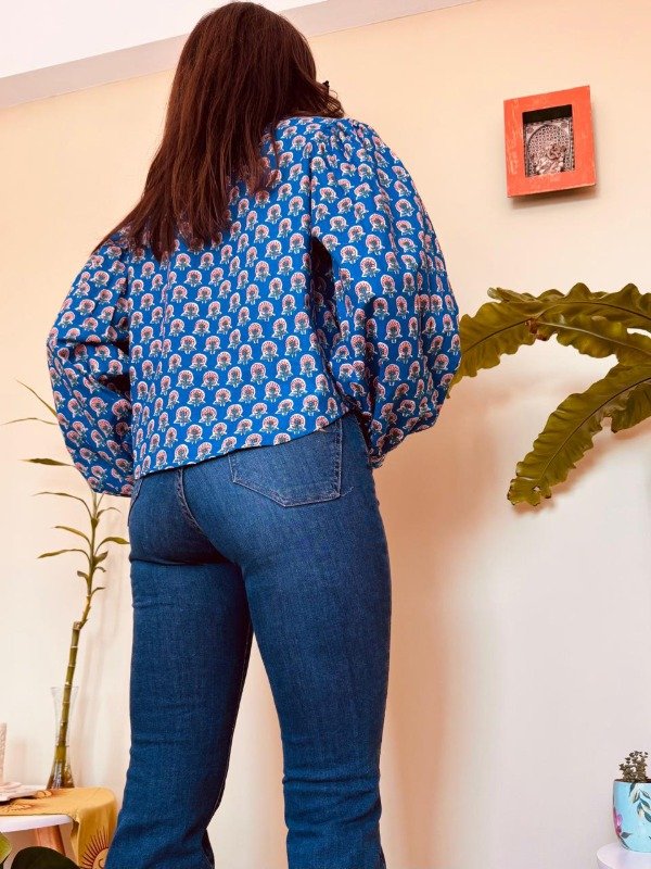 El estampado en tonos azules profundos con detalles en verde y coral resalta sobre el fondo índigo, evocando frescura y vitalidad en una prenda de impronta artesanal y auténtica.