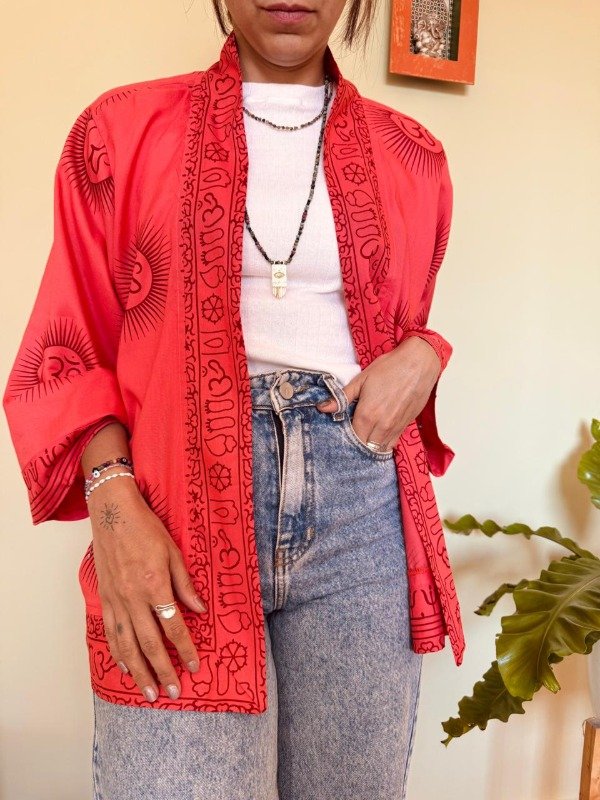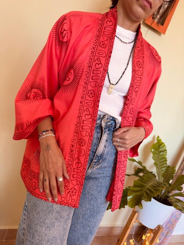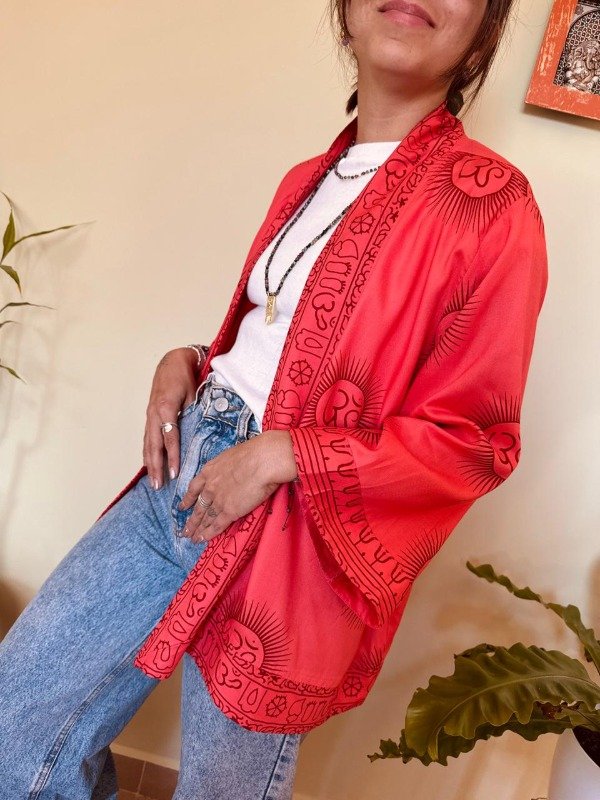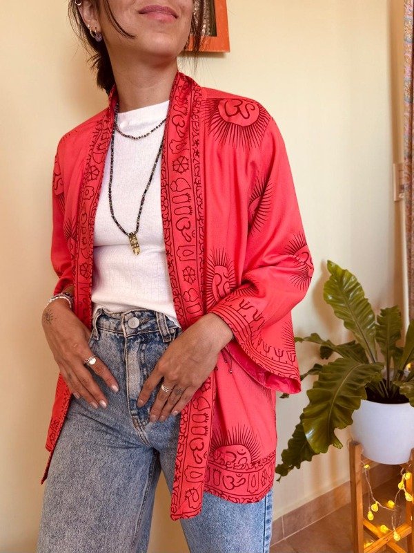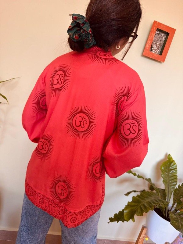 El estampado en tonos rojo intenso con símbolos sagrados Om en negro lo dota de fuerza y vitalidad, evocando la energía del amanecer y el poder del sol. Con corte holgado, mangas rectas y caída fluida, es ideal tanto para la vida cotidiana como para momentos de conexión personal.