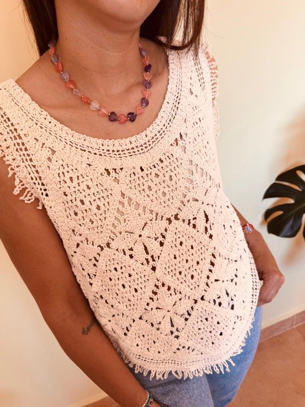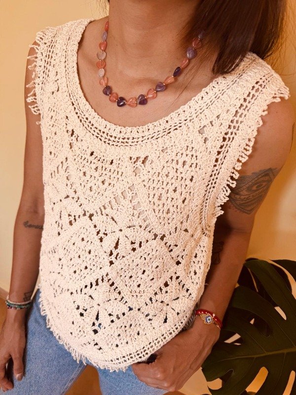 Chaleco tejido artesanalmente en hilo, con diseño calado geométrico al frente y trama abierta en la parte posterior.