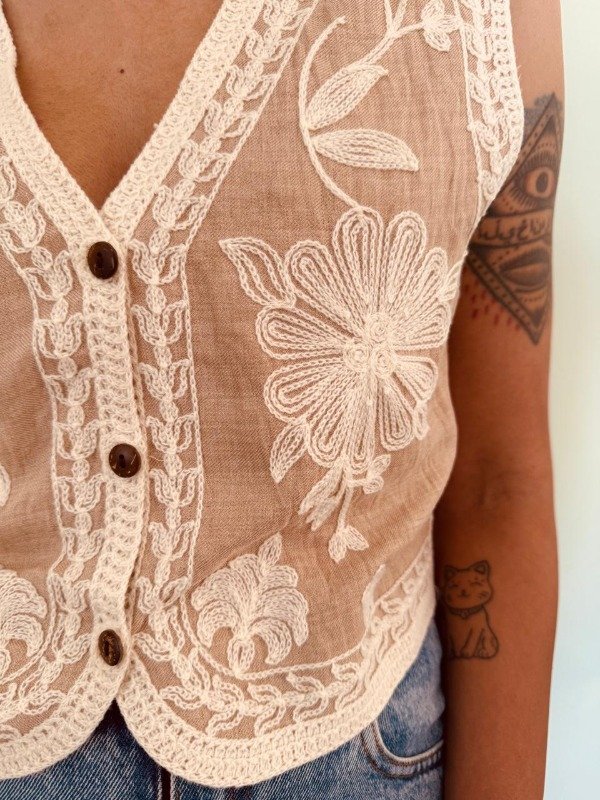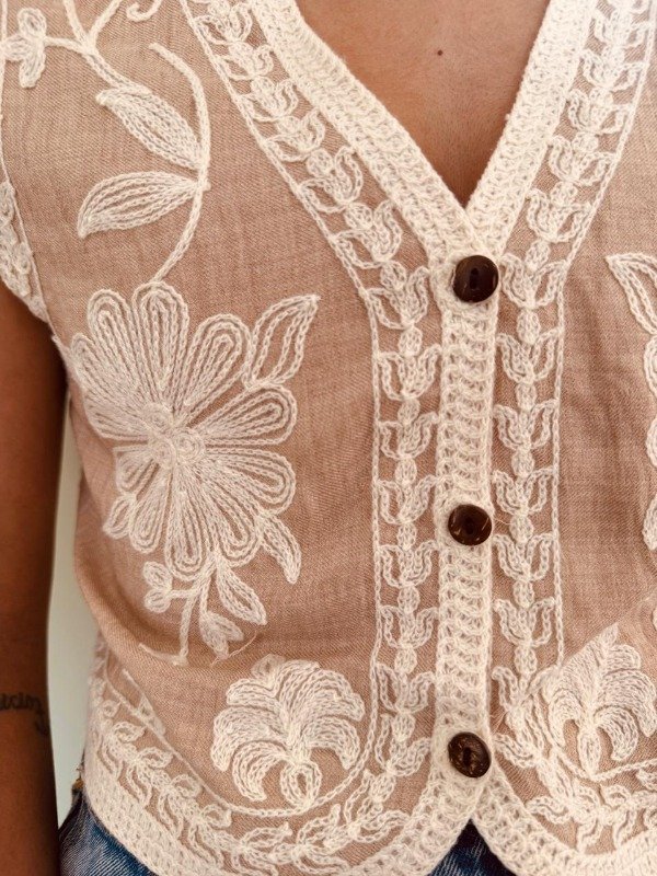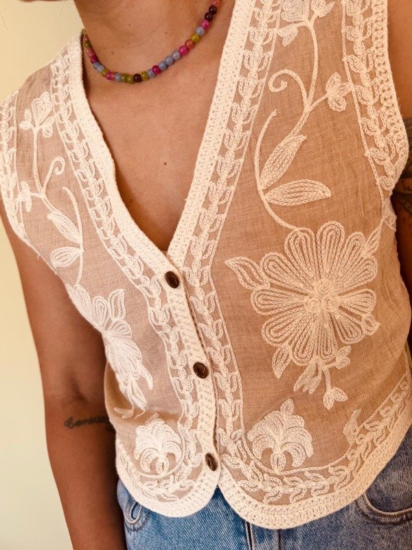 Chaleco liviano con base translúcida y delicados bordados florales en hilo.