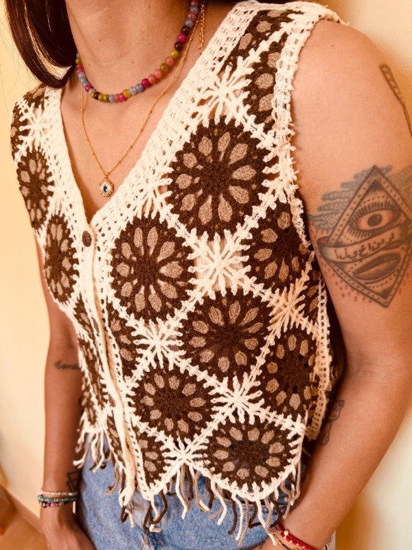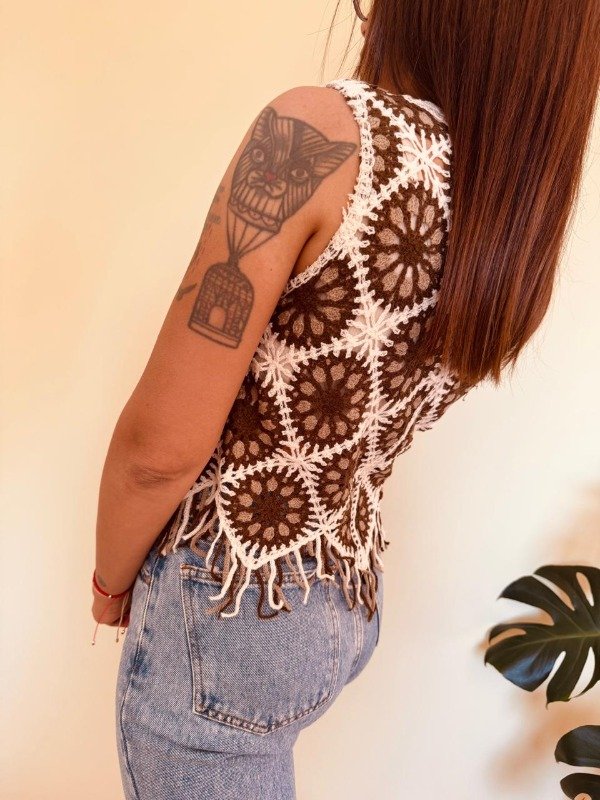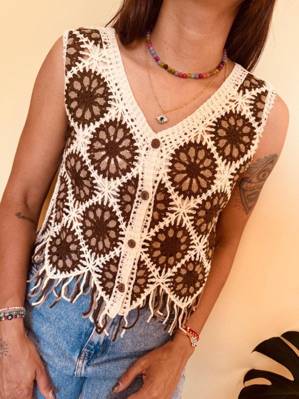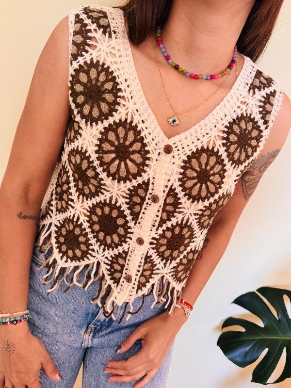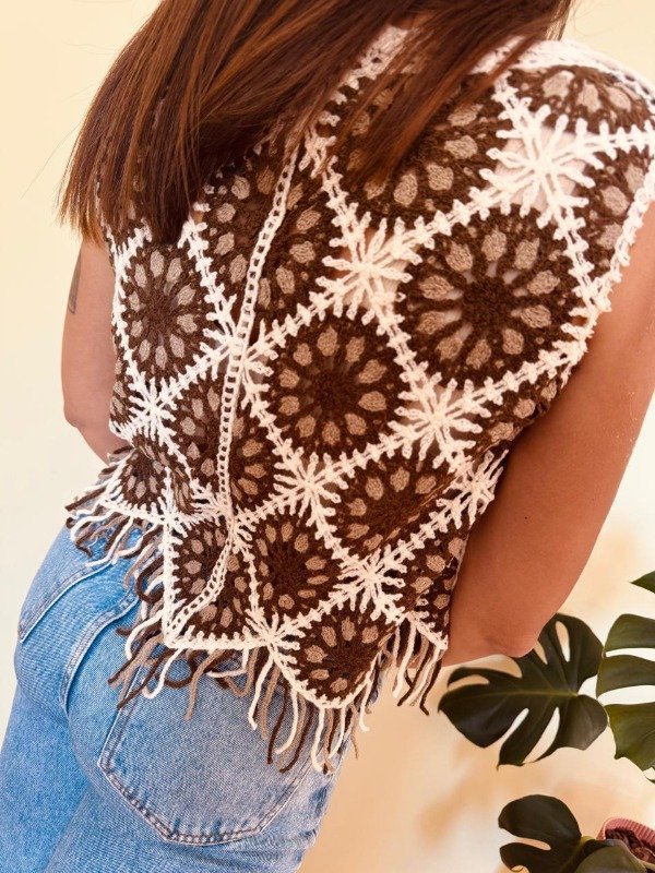 Chaleco tejido artesanalmente en hilo, con diseño geométrico calado y terminaciones con flecos en la base.