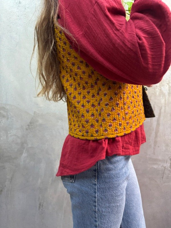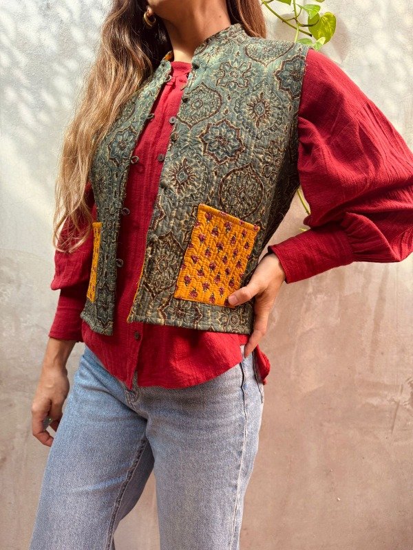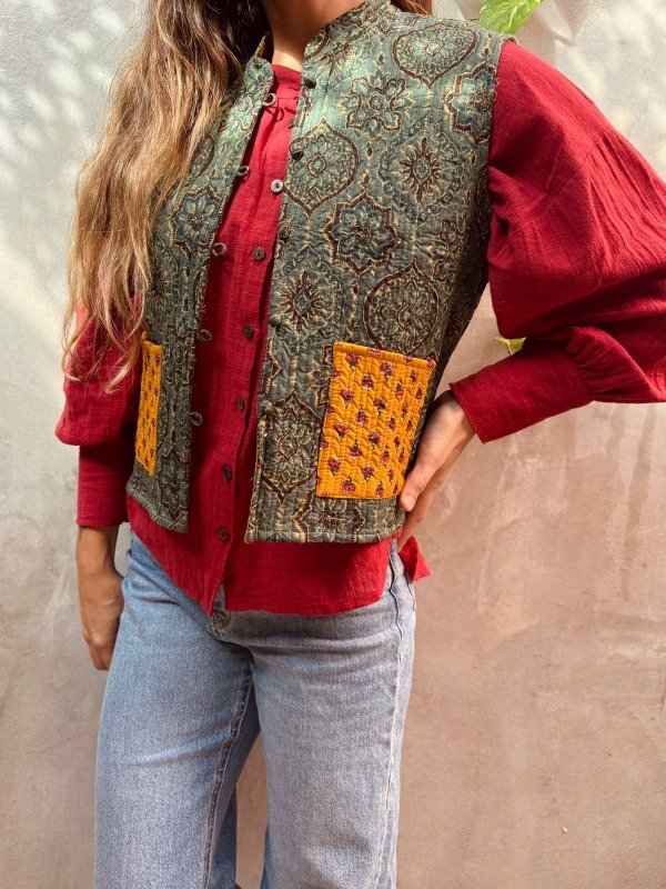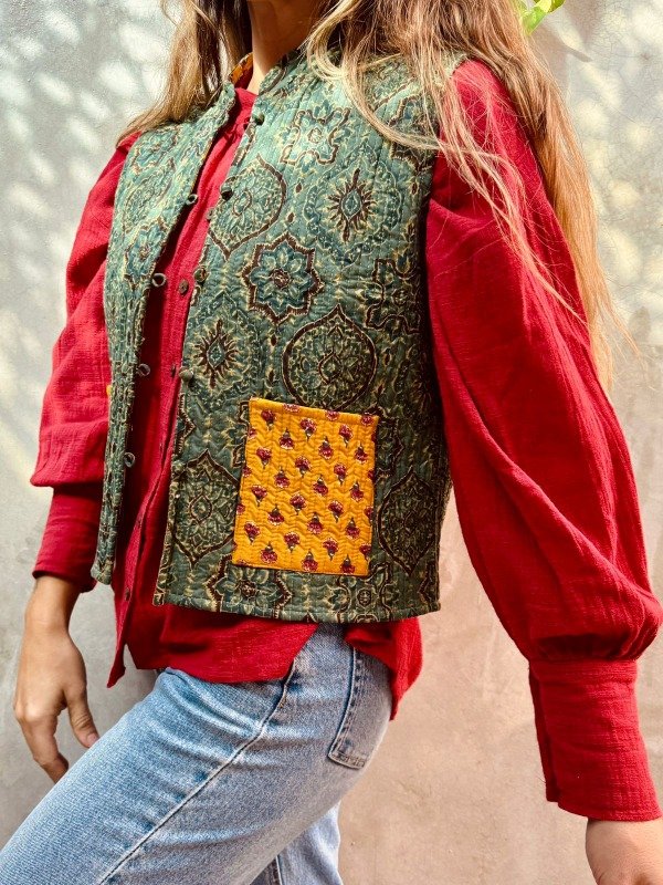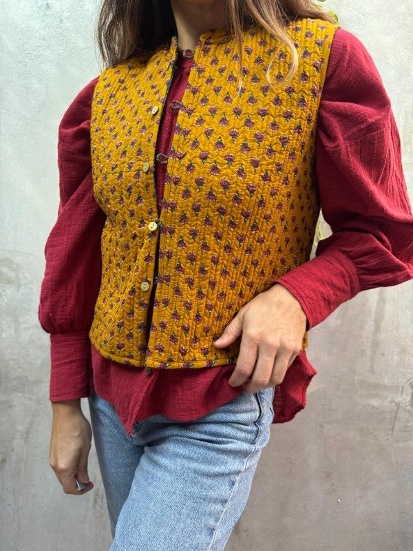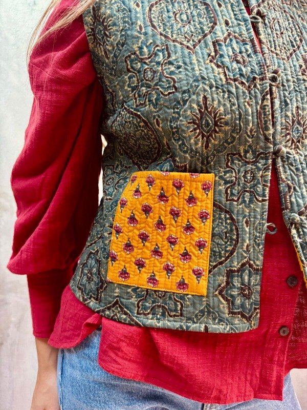 Confeccionado en 100% algodón con la técnica artesanal block print, este chaleco fue hecho íntegramente en la India, combinando tradición textil y diseño contemporáneo.