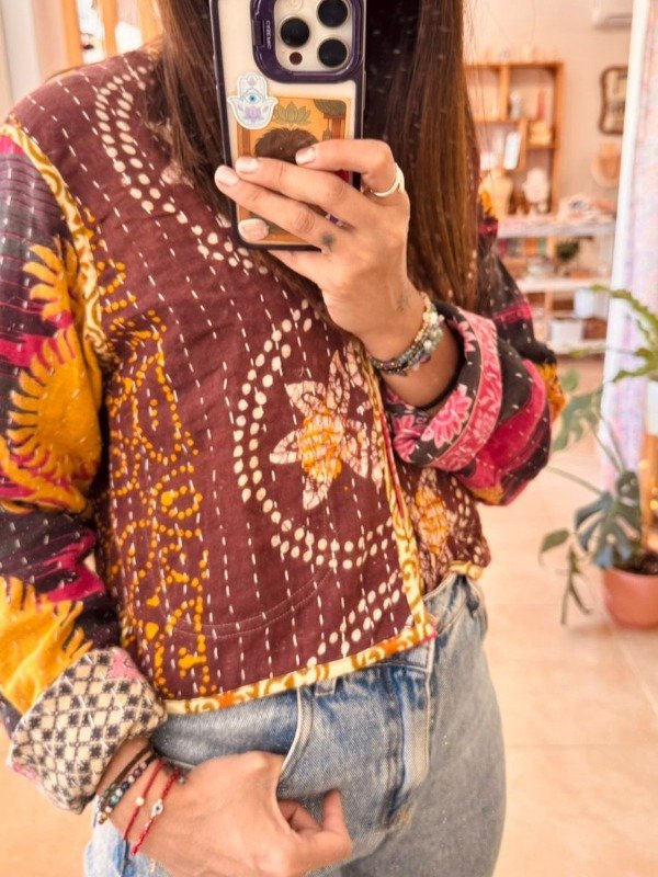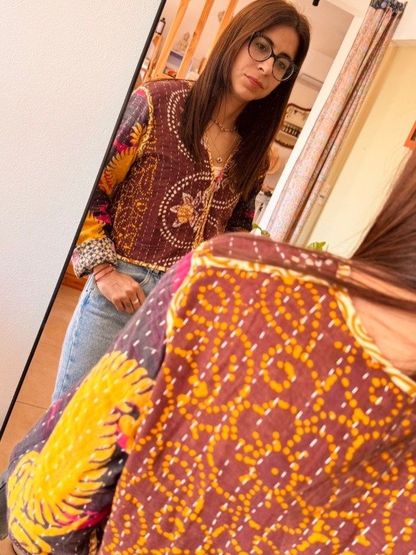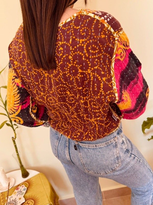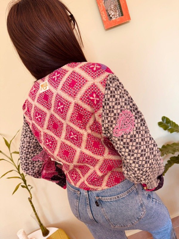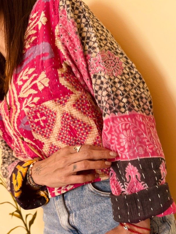 Esta chaqueta está confeccionada en 100% algodón mediante la técnica Kantha, combinando retazos que se transforman en un diseño irrepetible. Es reversible, ofreciendo dos estilos diferentes: en un lado, predominan los tonos fucsia y rosa con estampas geométricas y florales, creando una estética vibrante y alegre; en el reverso, destacan los tonos tierra con base marrón y detalles mostaza y naranjas, aportando calidez y fuerza. Tanto en las mangas como en el frente se integran telas distintas, generando un contraste visual artesanal y lleno de carácter.