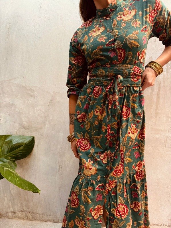Un vestido único de espíritu libre y esencia artesanal. Confeccionado en algodón 100% estampado con la técnica ancestral block print y teñido con tintes naturales, cada pieza refleja la riqueza cultural y la belleza imperfecta de lo hecho a mano.