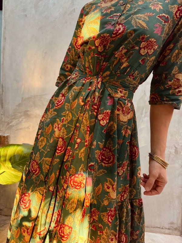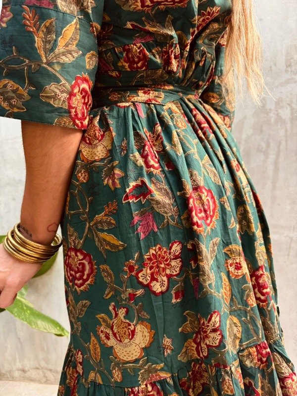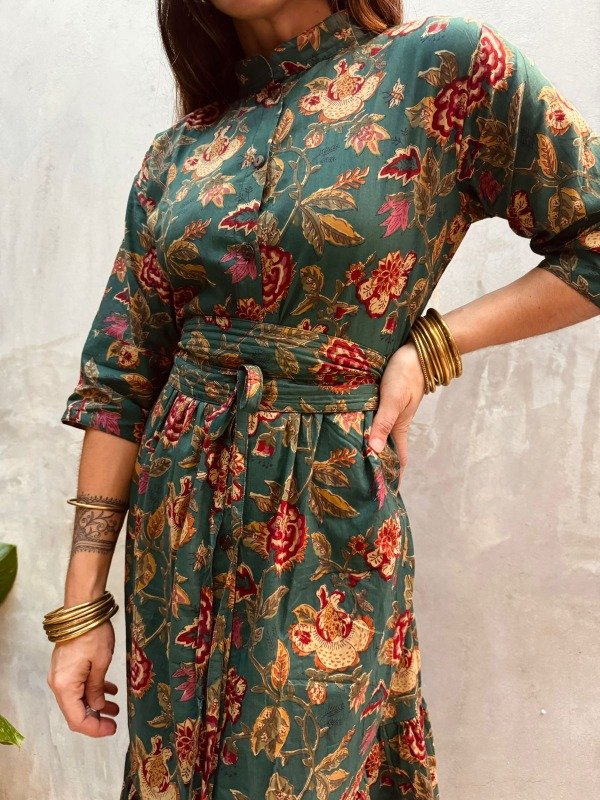 Este modelo resalta por su base verde profundo que se ilumina con flores en tonos bordó, mostaza y toques dorados, creando un contraste vibrante y sofisticado. Su diseño fluido y artesanal lo convierte en una prenda que trasciende temporadas: auténtica, fresca y con alma viajera.