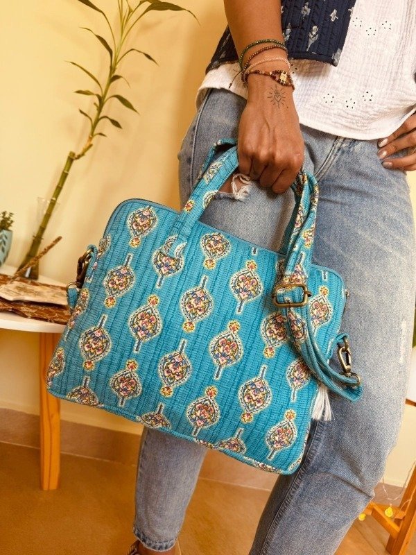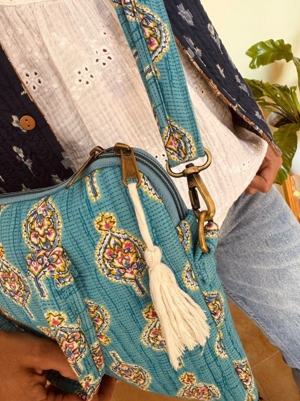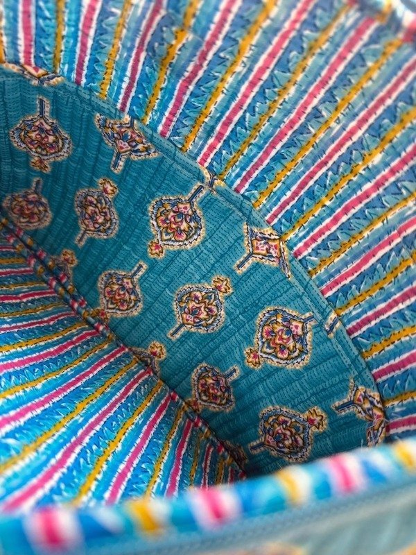 Bolso confeccionado en doble capa de algodón 100 % de la India, con costuras verticales que aportan una textura acolchada, suave y resistente.