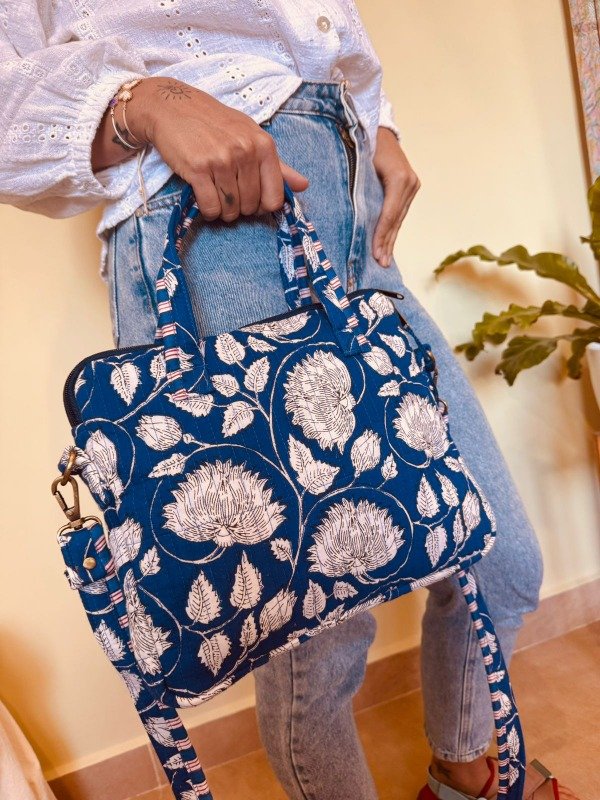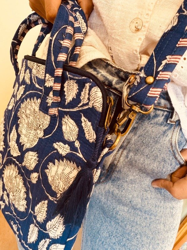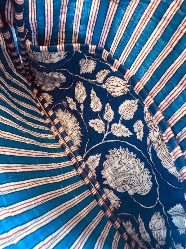 Bolso confeccionado en doble capa de algodón 100 % de la India, con costuras verticales que aportan una textura acolchada, suave y resistente.