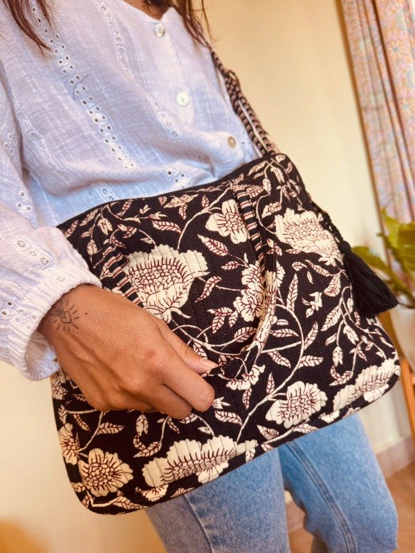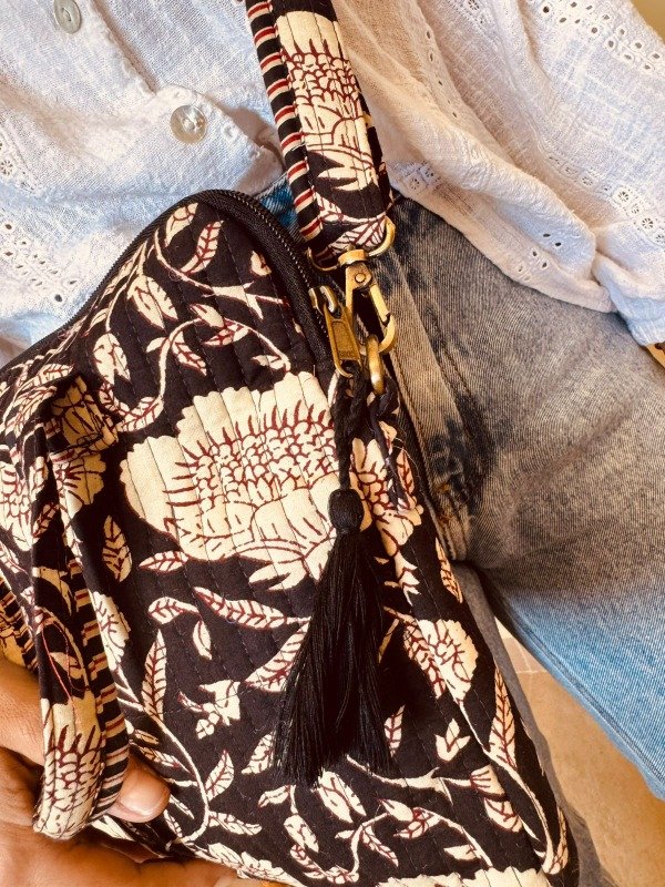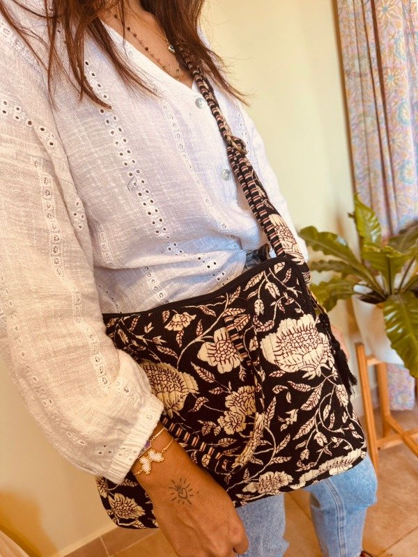 Bolso confeccionado en doble capa de algodón 100 % de la India, con costuras verticales que aportan una textura acolchada, suave y resistente.