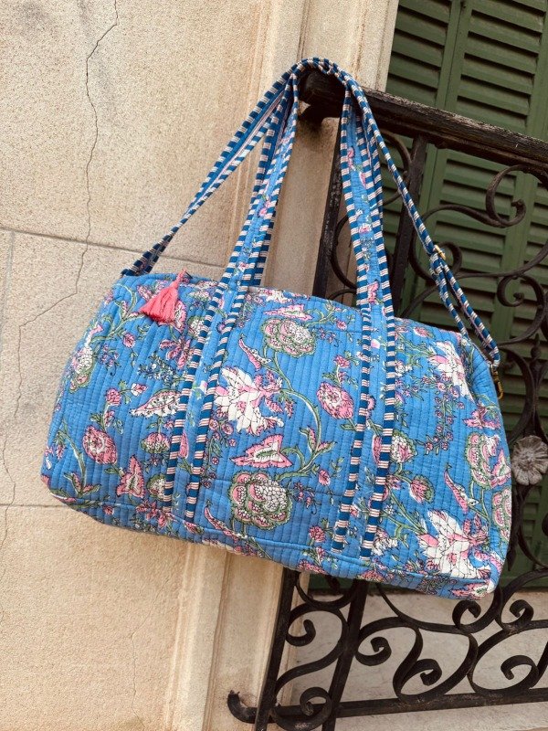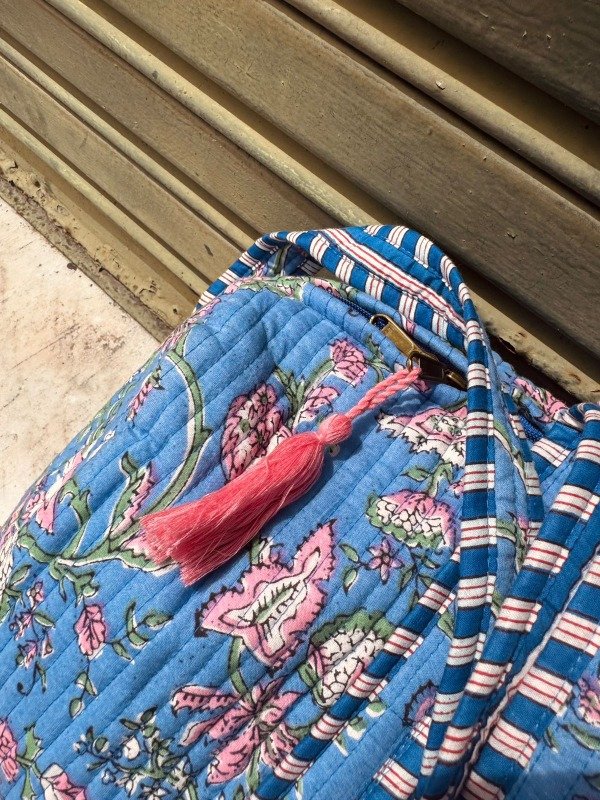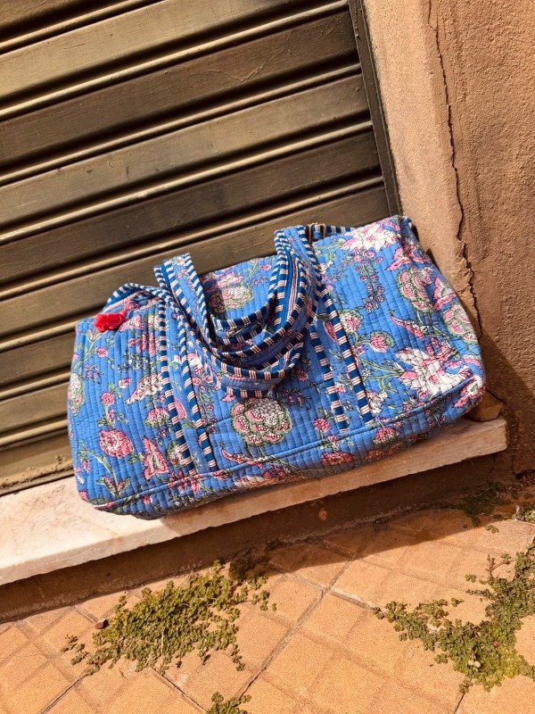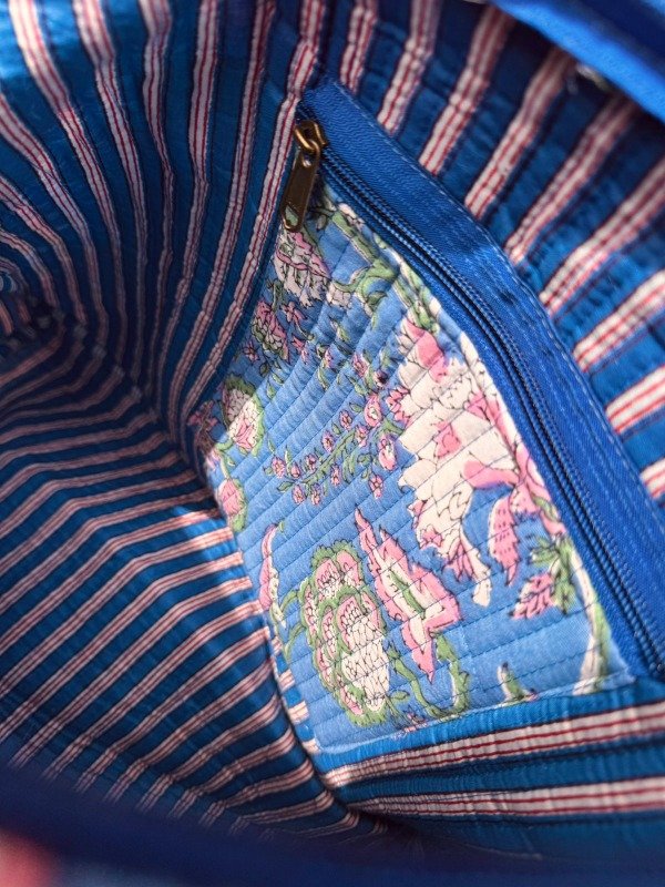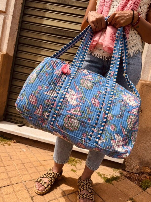 Bolso confeccionado en doble capa de algodón 100 % de la India, unidas por costuras verticales que crean una textura acolchada, suave y resistente.