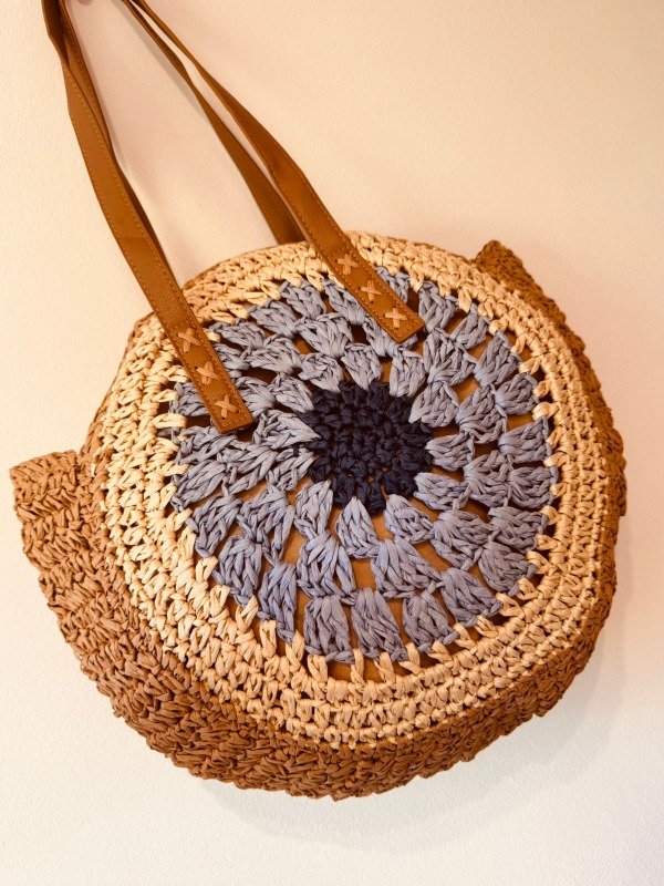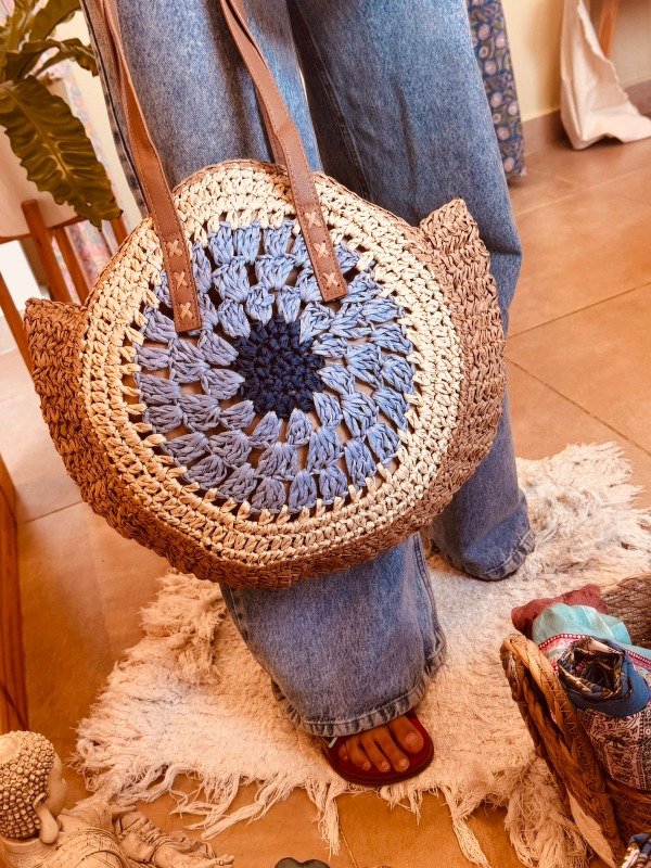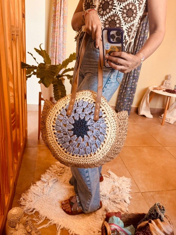 Esta cartera de rafia tejida combina un estilo boho con la energía protectora característica de Gurdwara.